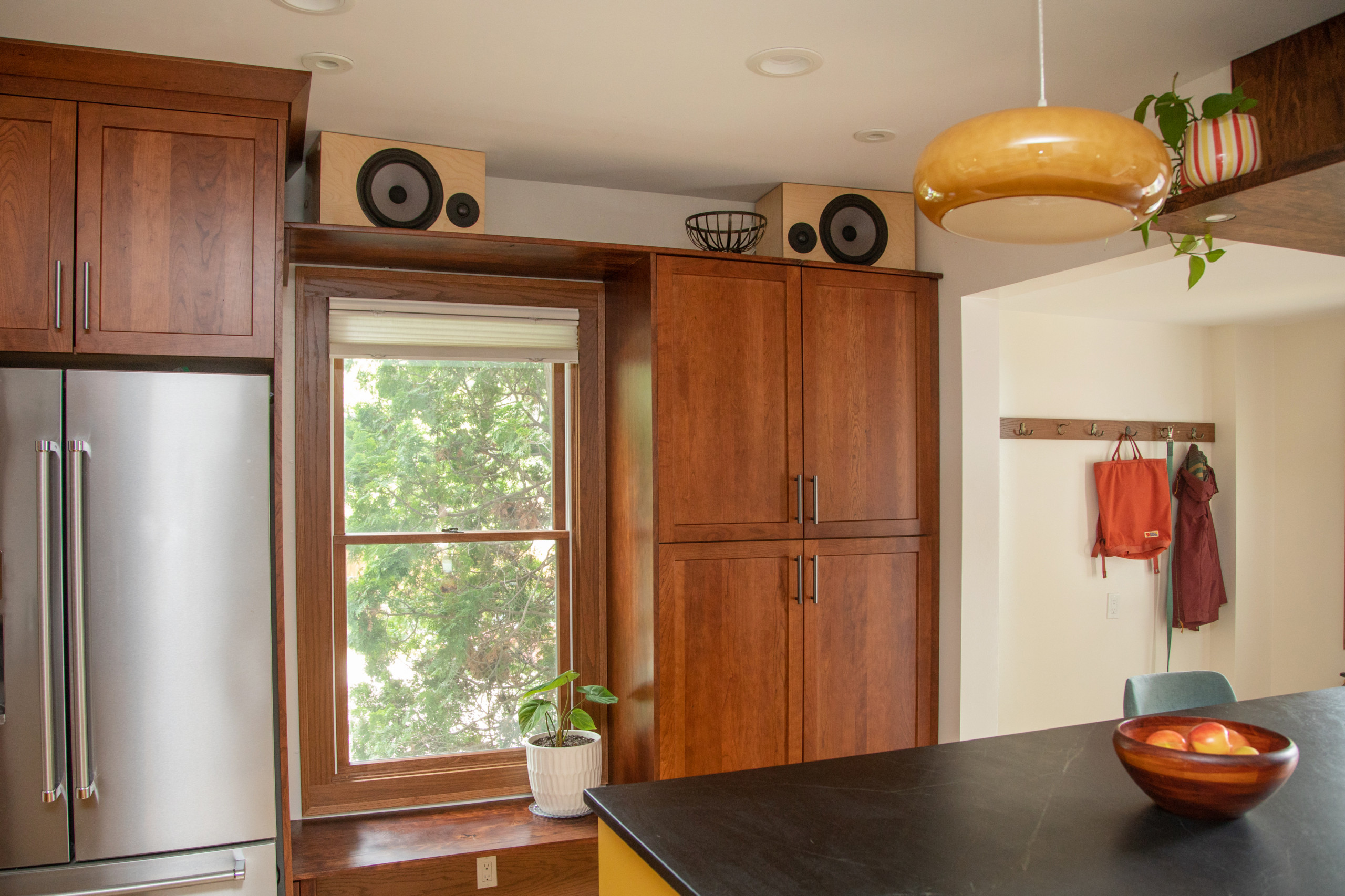 After: A new built-in pantry cabinet replaces the makeshift storage for a cleaner look. A built-in bench under the window offers another spot to sit and converse with the cook. A shelf spanning the top of the window holds new speakers. “We made sure to keep the cabinetry at a height that would allow space for the speakers,” Langreck says.