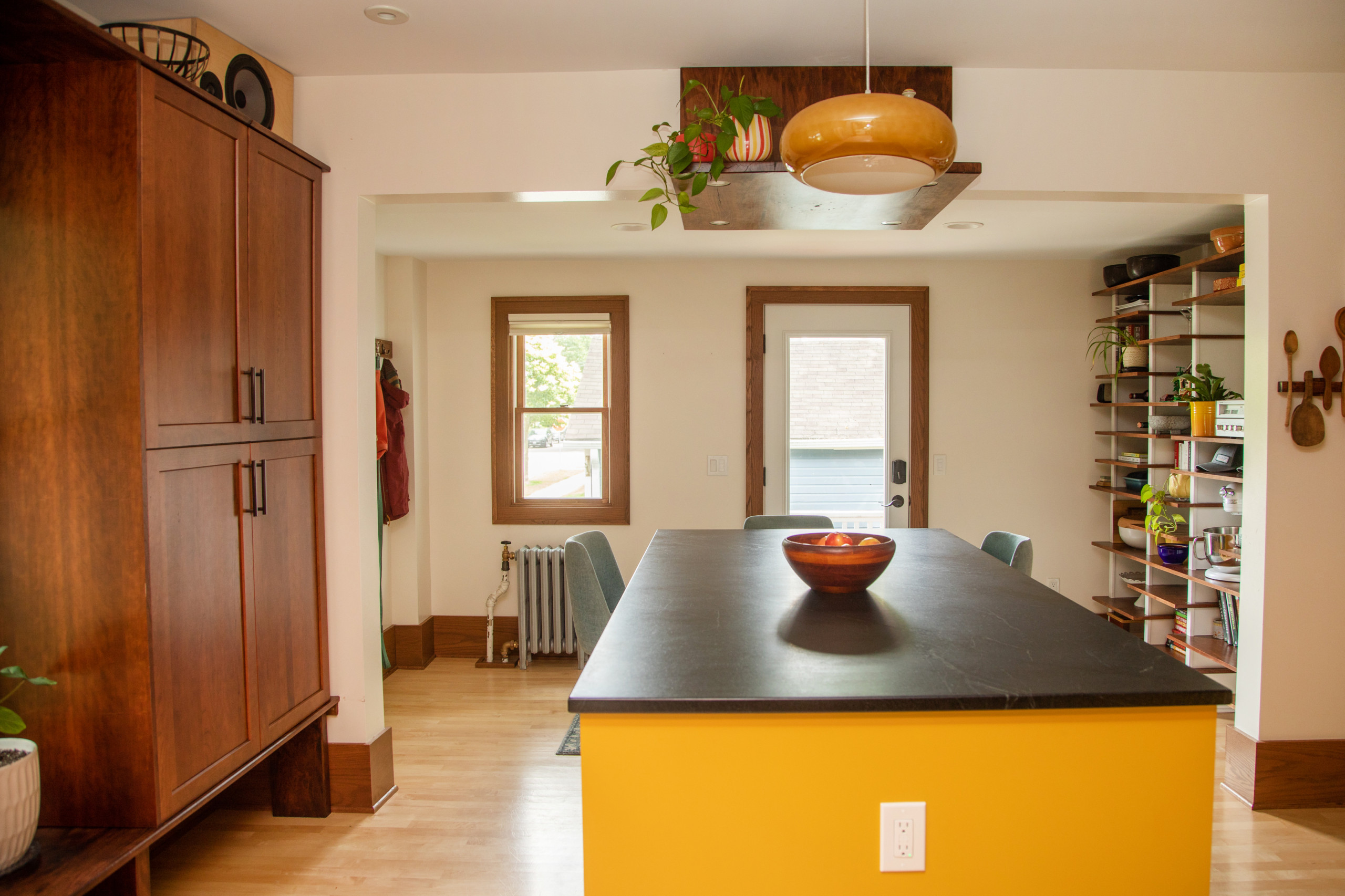 For this couple — a construction project manager who loves woodworking and a teacher who loves crafts — their home’s basic blue, white and black kitchen lacked warmth and personality. To remedy that, they hired designer Dana Langreck, who worked within the same footprint while enlarging an opening between the kitchen and mudroom to gain some breathing room. Stained cherry and warm yellow cabinets create a cheerful look and feel. New natural maple flooring grounds the updated space in more warmth. Soapstone countertops add a bold touch.