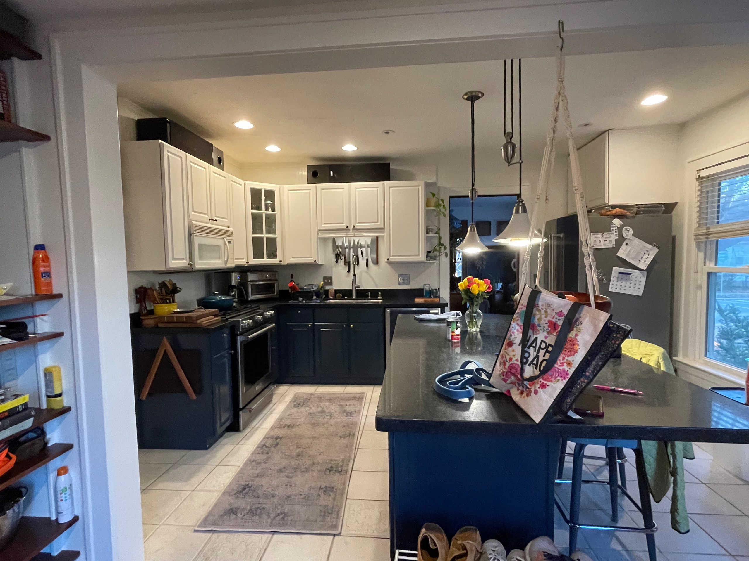 This view shows the updated kitchen looking toward the mudroom area. The door leads to a detached garage. “That was an addition to the house many years ago,” Langreck says of the mudroom. “It felt very disconnected from the kitchen. The goal was to make it one room. It feels like the whole room is connected now.”