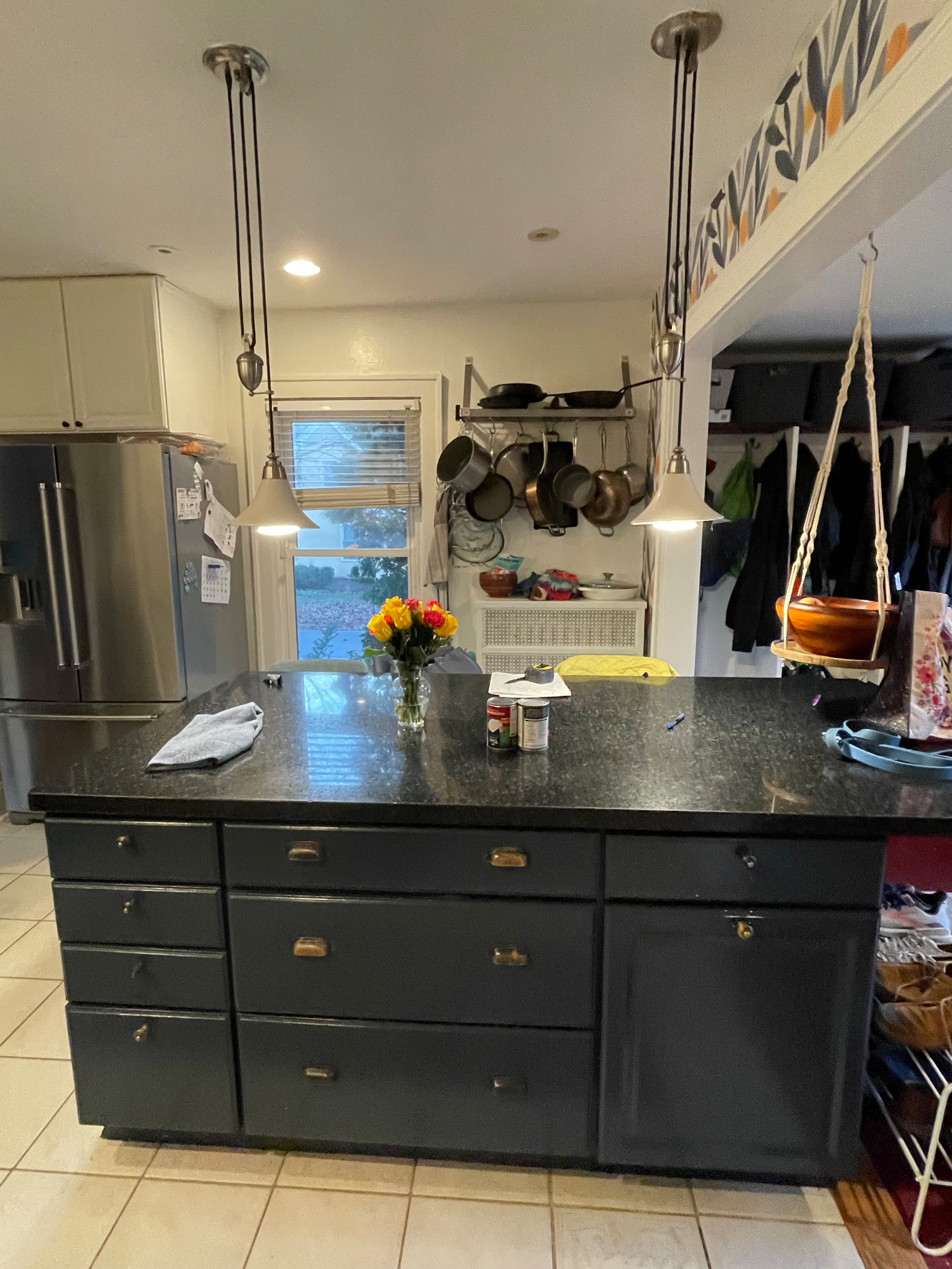Before: The former kitchen had basic cabinets that the couple tried to perk up by painting the lowers navy blue. But the result clashed with the black granite countertops. White ceramic tile flooring gave the space a dated look. An opening in the foreground connected the kitchen to a spacious mudroom area, but a change from tile to wood flooring meant the island end wasn’t functional. “Because of a slanted floor there, you couldn’t put a chair there, and it felt like you were hanging out in the mudroom instead of the kitchen,” Langreck says.