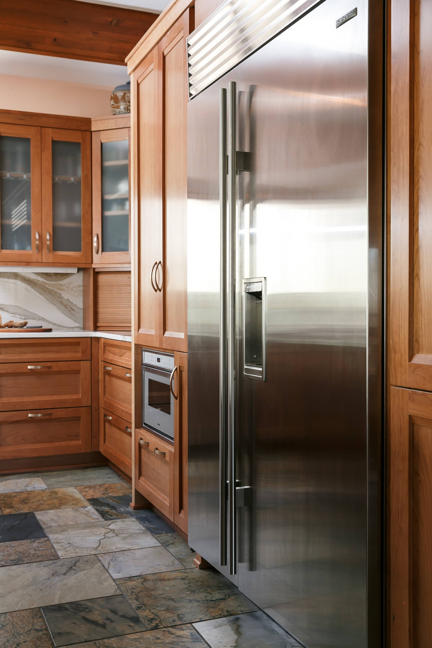 A couple of upper cabinets in the back corner of the kitchen, used for everyday dishes and glasses, feature satin etched glass doors that help lighten things up.