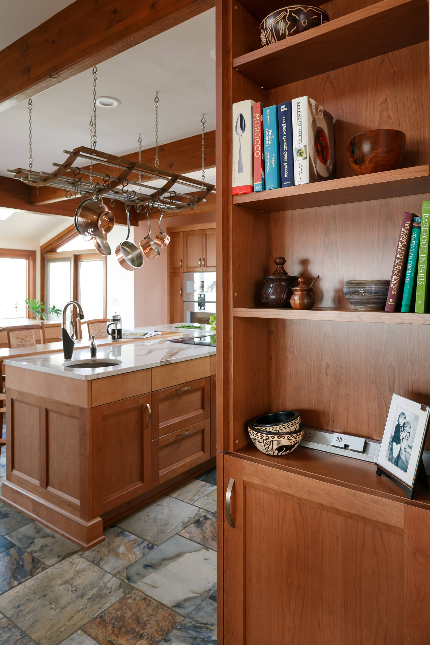 Looking into the kitchen from a corner just off the home’s entry offers a look at this tall built-in cabinet with shelves for decorative items and books.