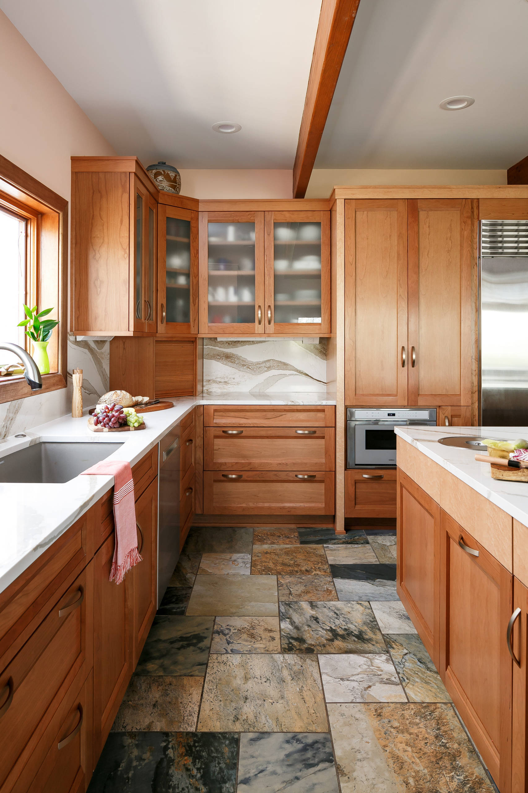 The floor tile was existing, and is a mix of 18-by-18-inch and 12-by-12-inch porcelain tiles that were patched where needed for the renovation. “It has a slate look with coppery tones and grays, all that natural stone you see in a riverbed,” Culbertson says.