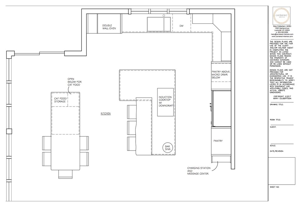 This wider view, also taken from off the home’s entry, shows the added second island with its natural cherry top. Previously this area included a stand-alone table that had become a drop zone. “It was really a wasted space, so we made it a more functional space where people could sit and be a part of the activity in the kitchen,” Culbertson says. “Adding the second island was a lifesaver, because it added storage for what she doesn’t use often, as well as a place for cat food.”