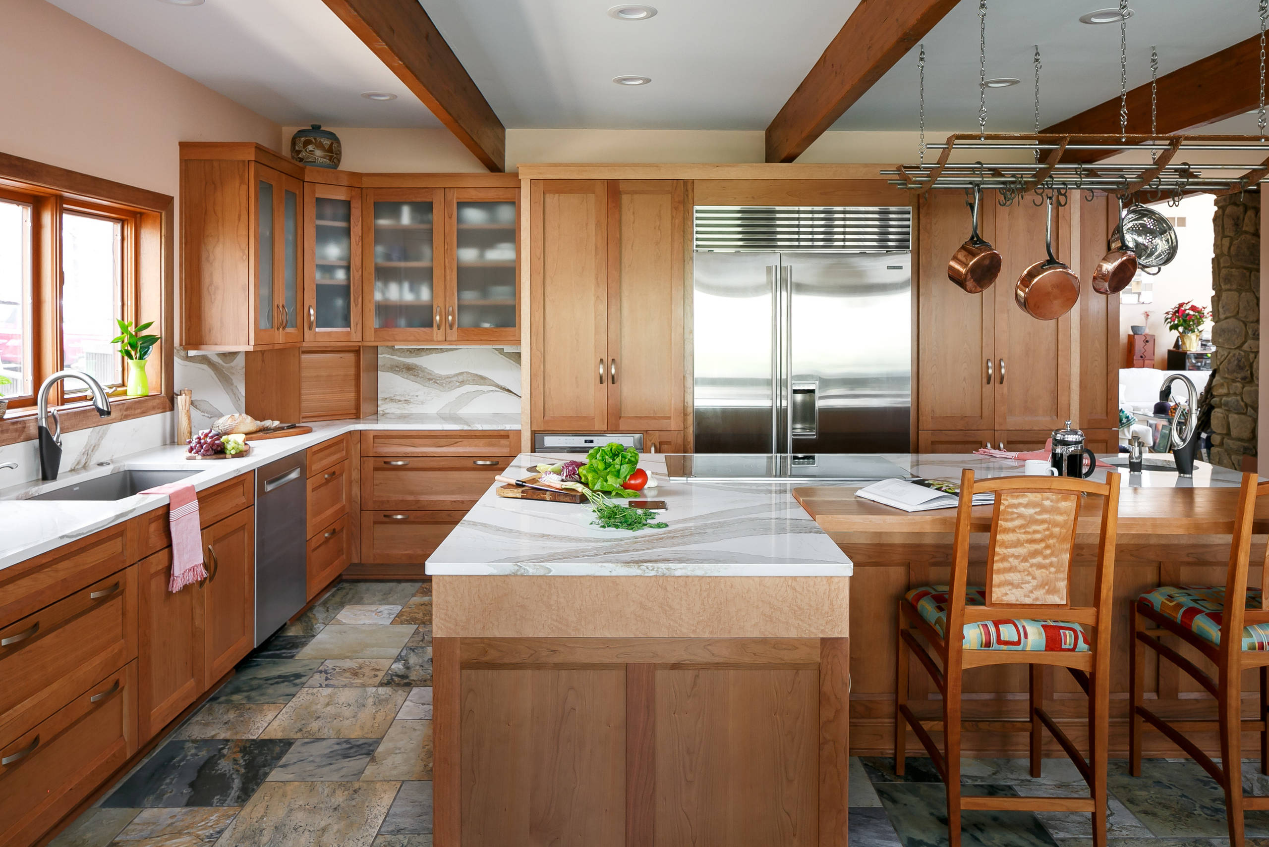 The Rodgers hired sister designers Mary Culbertson and Susan Haggblom, whom they had worked with on other projects in their home. Their new kitchen has an organized layout with a second island and gorgeous cherry and bird’s-eye maple cabinets that reflect the couple’s love of nature and natural materials.