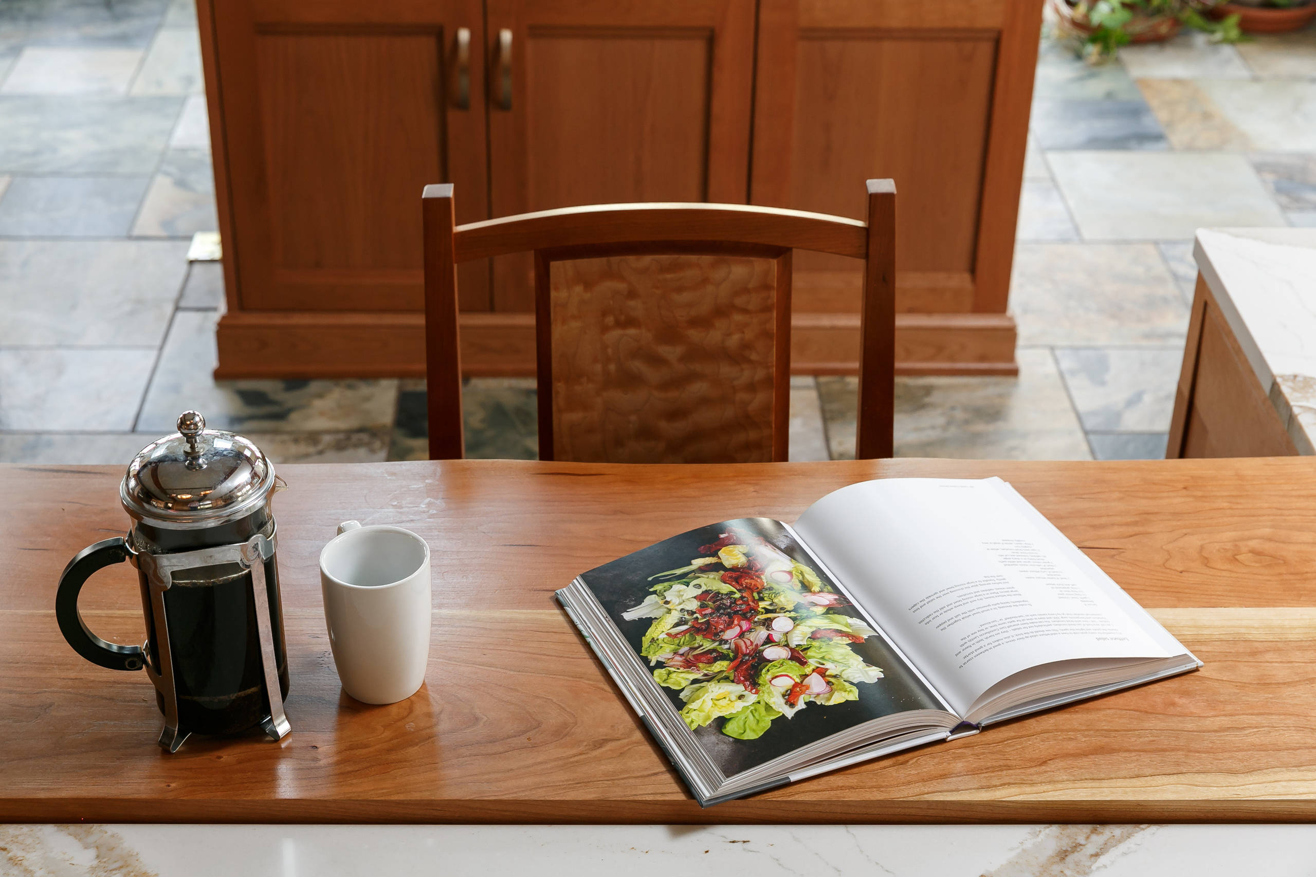 The previous kitchen featured outdated appliances, worn cherry cabinets and laminate counters. There was also a breakfast area that the couple rarely used and which had become a crowded landing zone. “They were tired of the chaos and needed a place where Tania could come in, work and make her amazing meals,” Culbertson says.