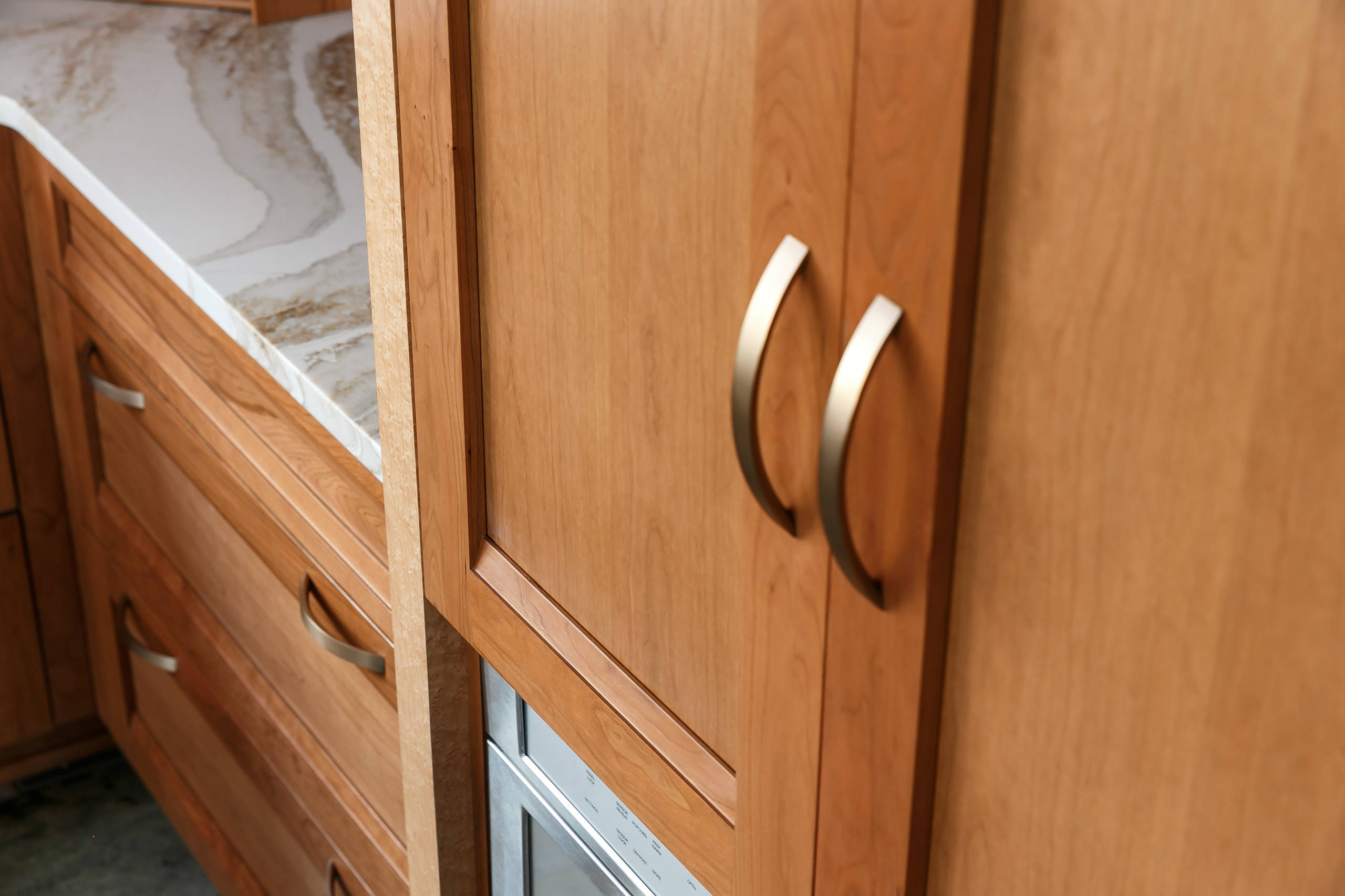 The main island has a quartz top with a cherry base and bird’s-eye maple touch-latch drawers for contrast. These coordinate with the custom stools, also made of cherry and bird’s-eye maple. The island offers lots of prep space, with a round bar sink for cleaning vegetables and washing hands.