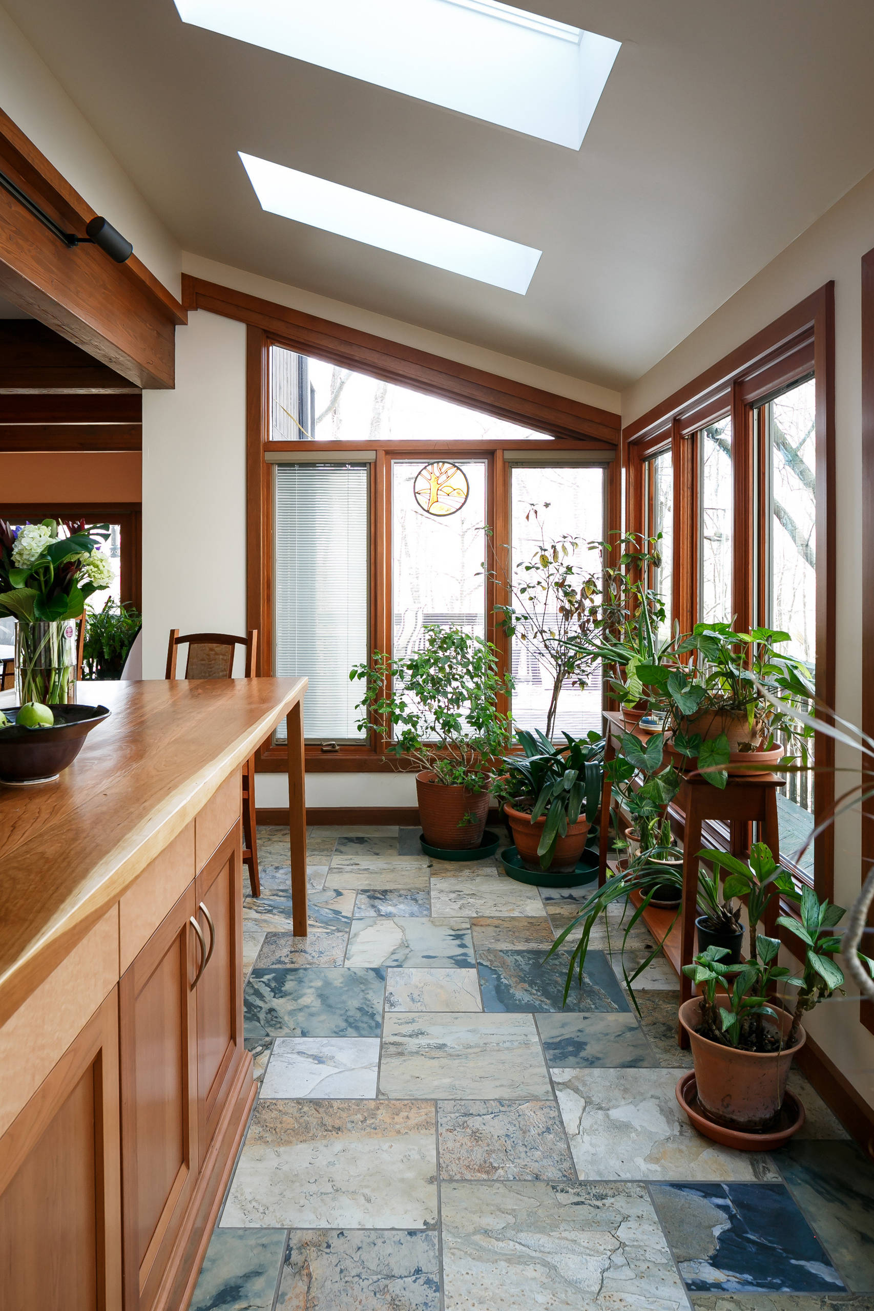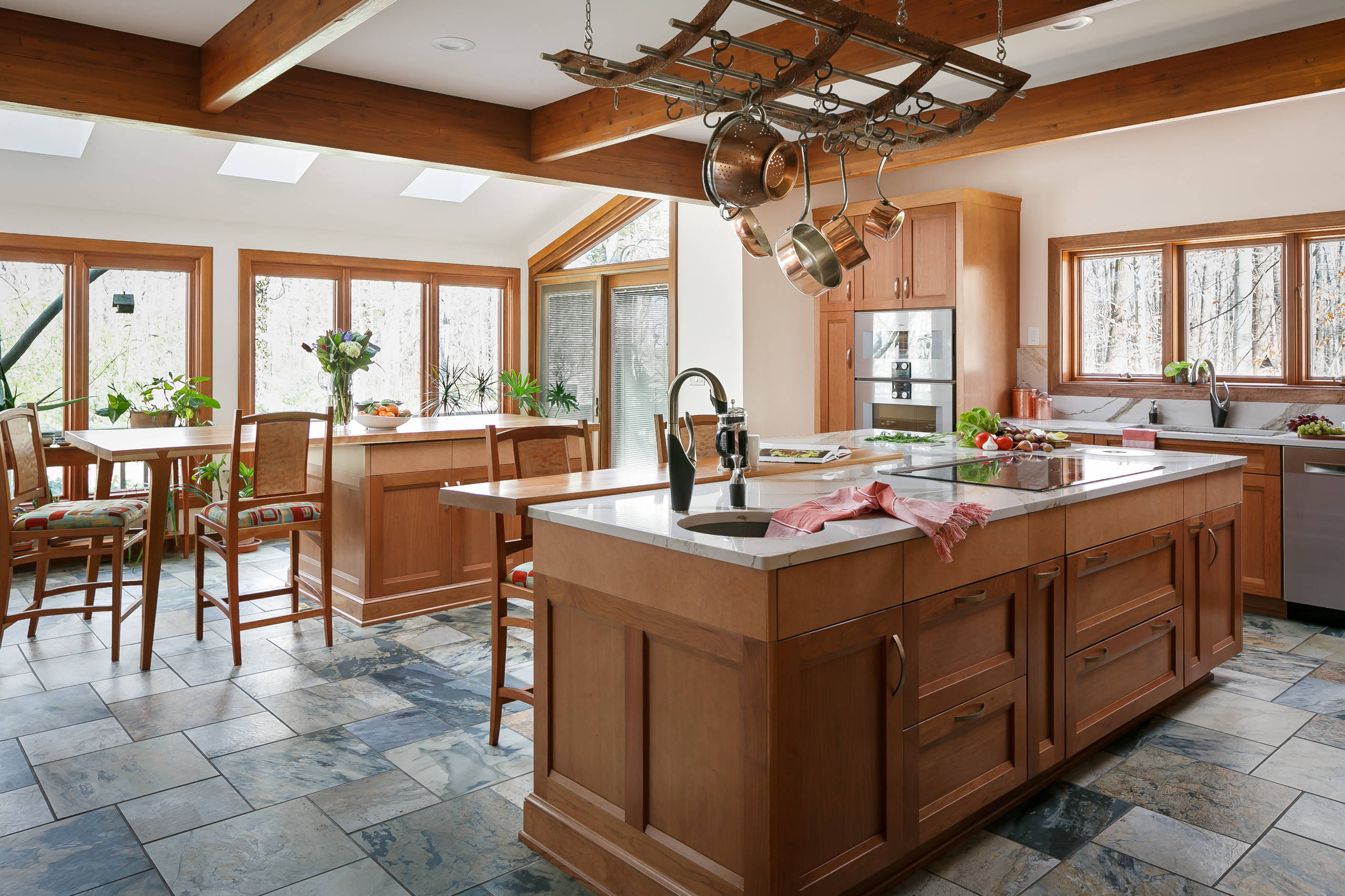 A corner by the second island includes skylights that were replaced and large windows that overlook the woods and a deck that wraps around the entire house. “The addition of the second island with the storage and seating allows you to enjoy the sunroom aspect of it, while also having the kitchen right there,” Culbertson says.