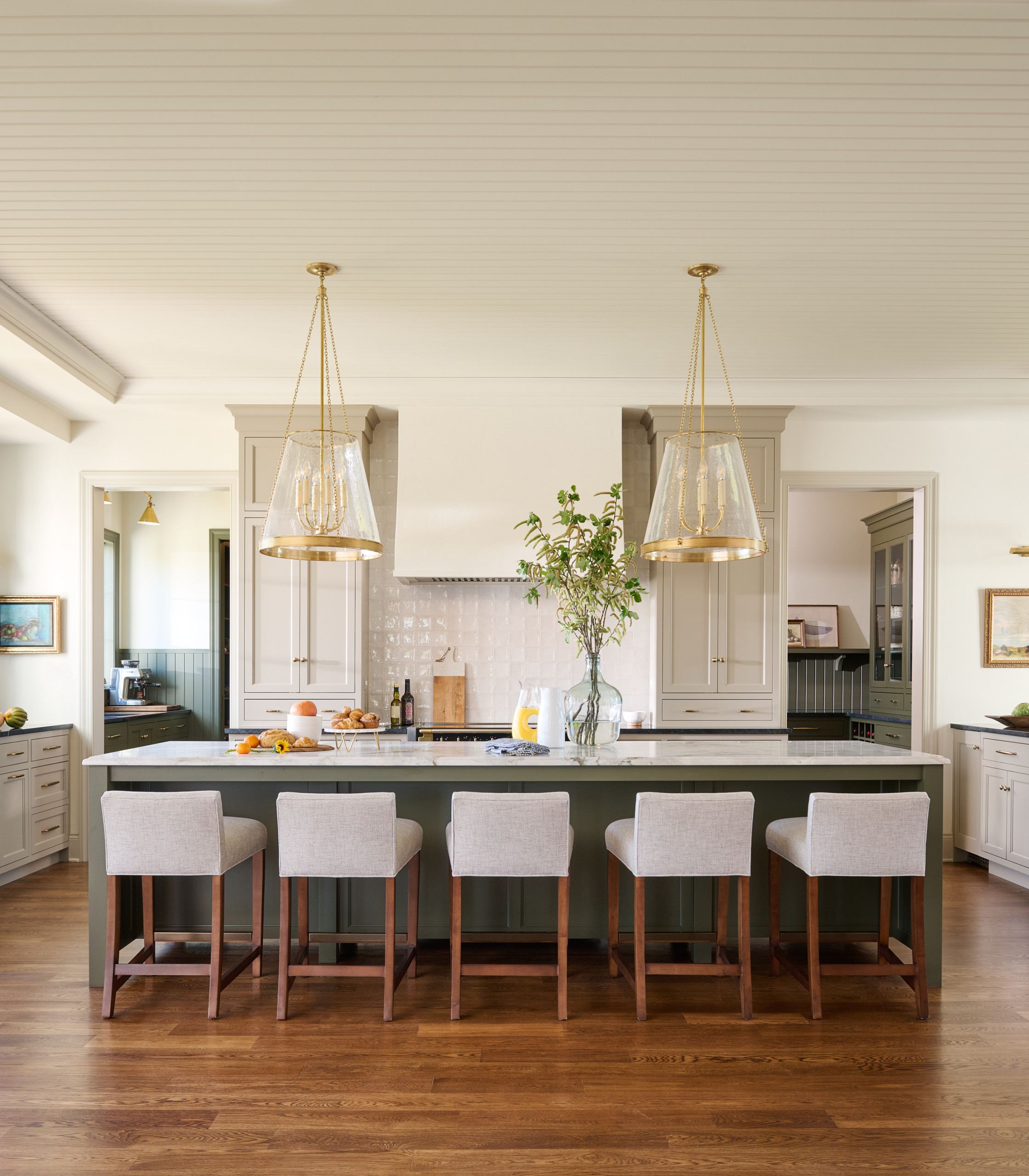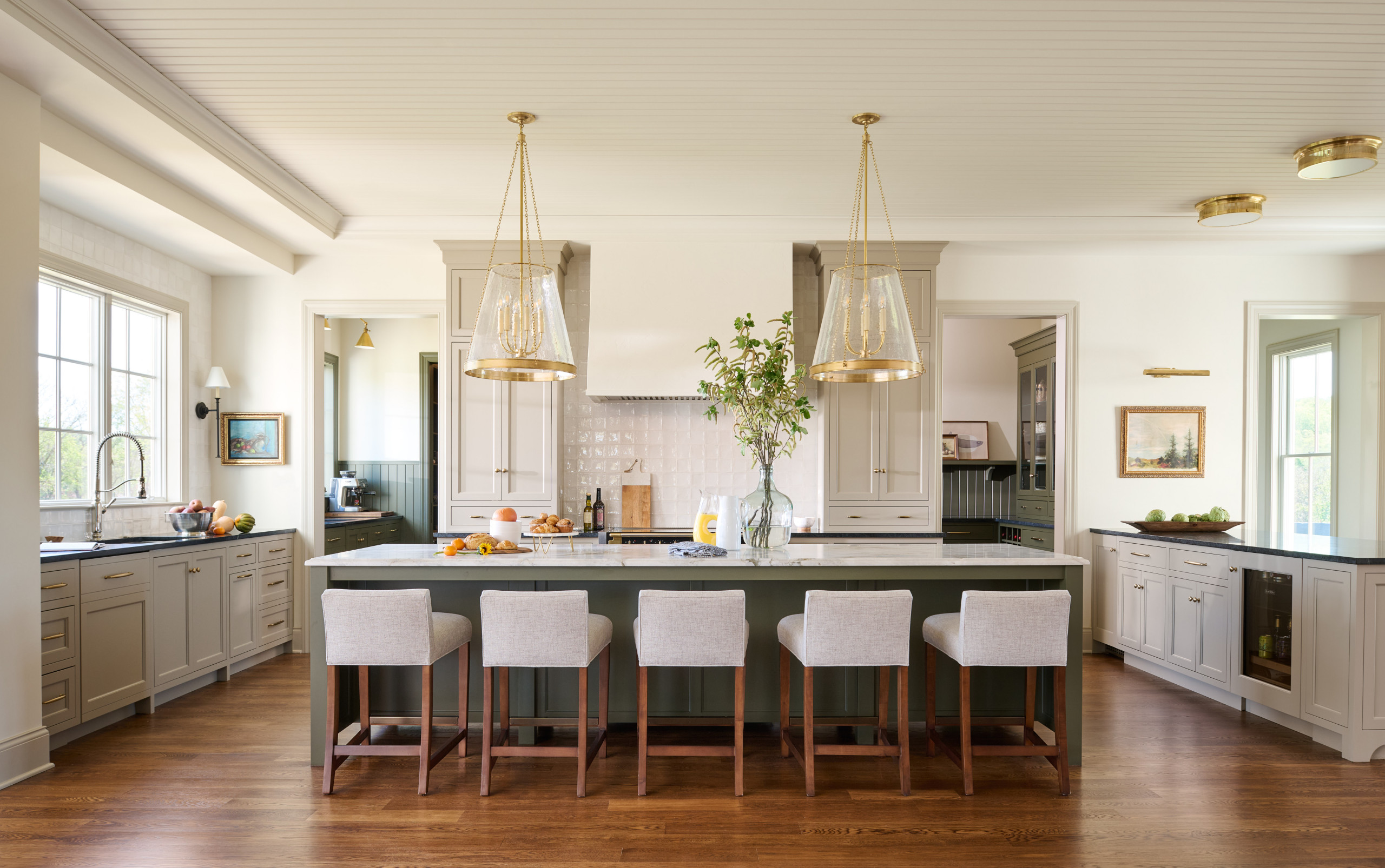 An 11-by-3½-foot island serves as the center of the kitchen and its English-kitchen-inspired green paint, marble countertop with an ogee edge and oversize glass pendant lights make it stand out. The seeded glass and knurled brass on the lights add texture and dimension, while their transparency keeps them from overwhelming the space. “I’d always rather have lights be oversized than anything that looks the slightest bit undersized,” Wunder says.