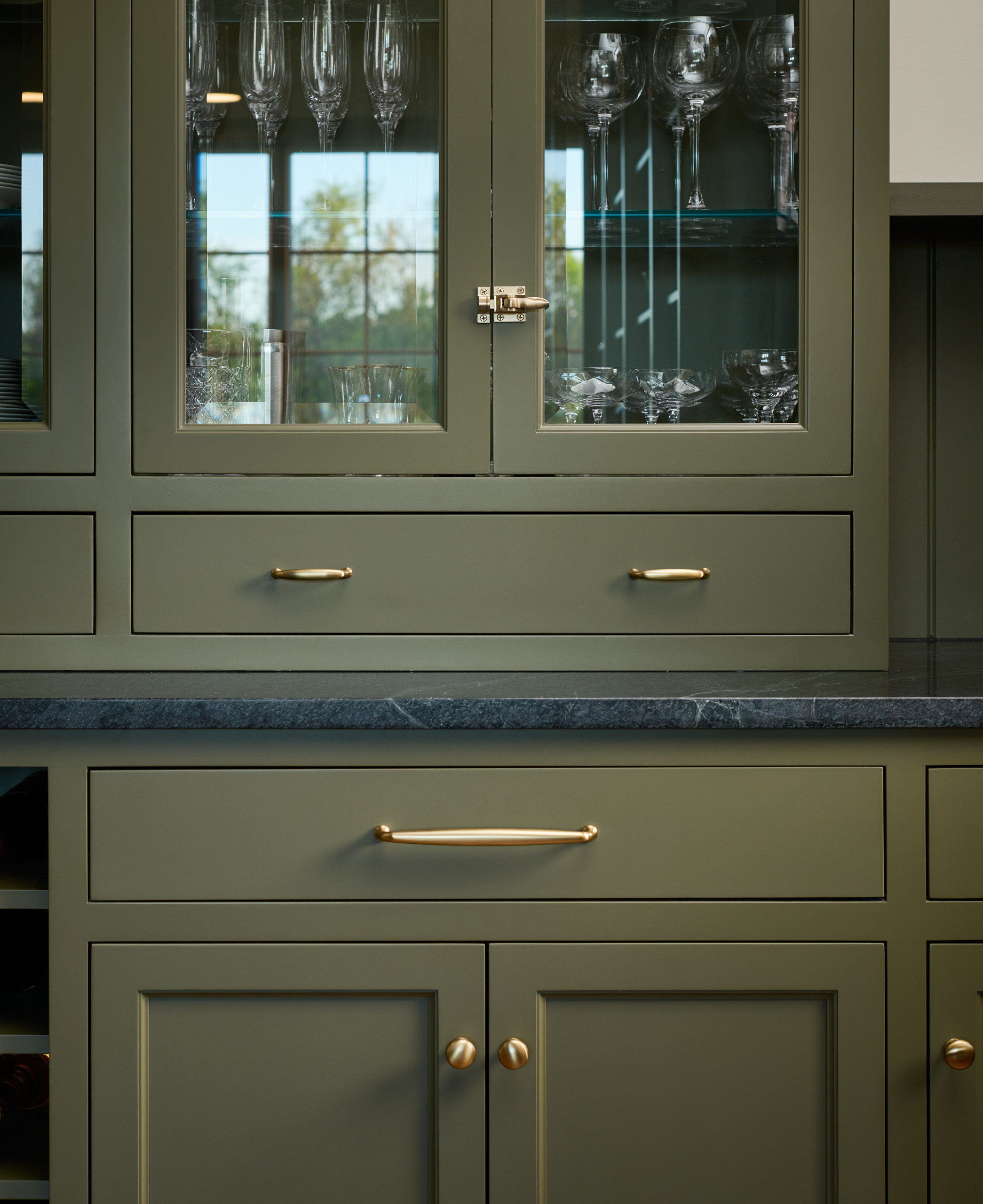 The back kitchen measures 190 square feet, and the fridge, sink and dishwasher are on the left. Expansive soapstone countertops provide additional prep space and room to mix drinks and serve wine. The glass cabinets offer space for barware and there are 20 cubbies sized for wine bottles.