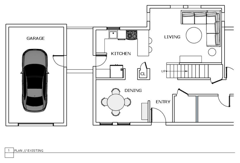 Before: This floor plan of the former spaces shows the kitchen (top center) closed off from the dining room (bottom center). A peninsula divided the kitchen from the living room (top right). The swing-out door in the kitchen is the white panel door that leads to the walkway and garage.