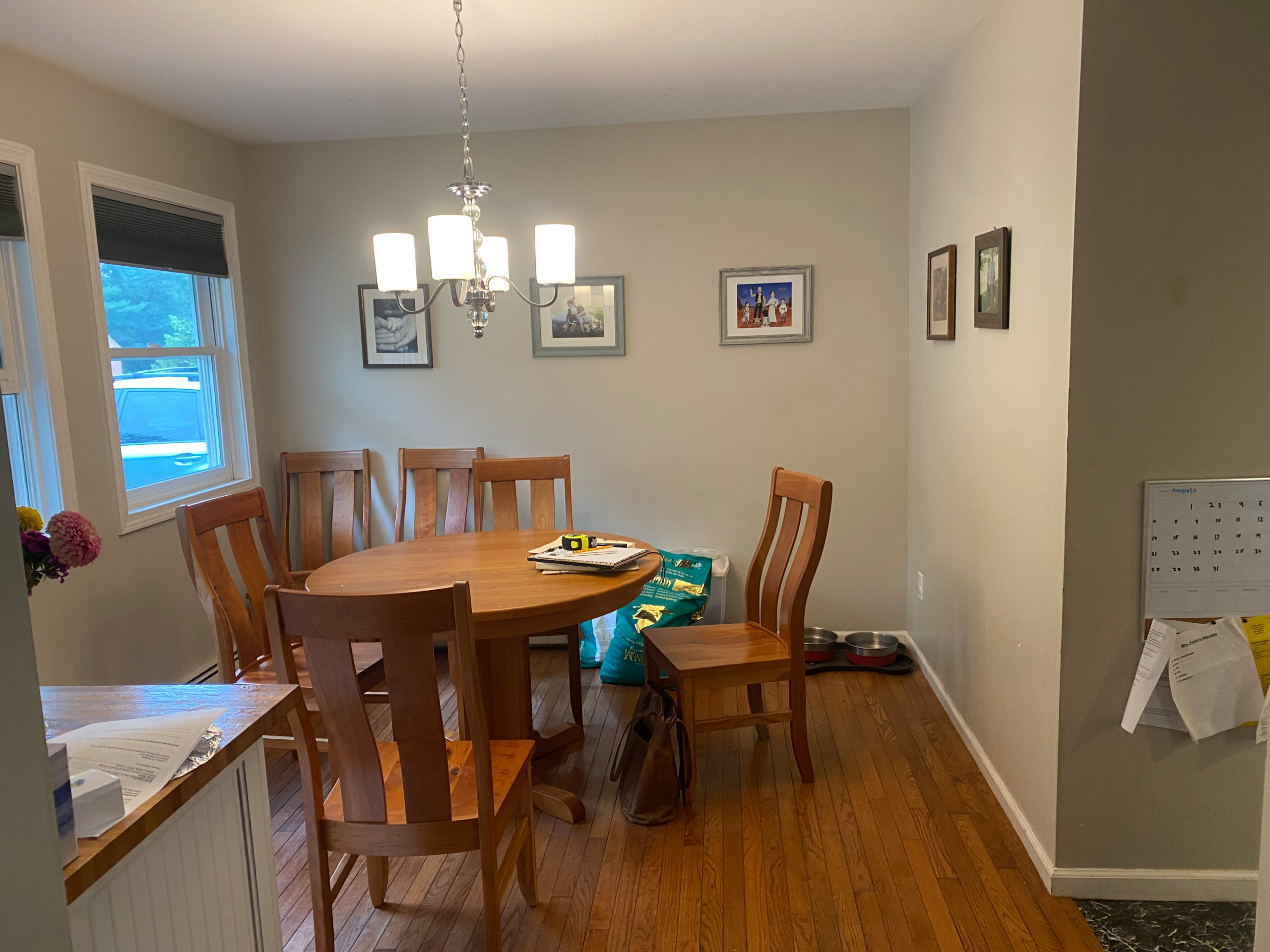 Before: The former kitchen in the 1992 New England Cape-style home had a cramped layout in 125 square feet. And what it lacked in size it didn’t make up for in style. There were honey oak cabinets, laminate counters and dizzying peel-and-stick vinyl tile flooring. A small peninsula wasn’t a good spot for gathering, and it blocked connection to the living room. A lack of cabinet storage resulted in cluttered countertops that ate up prep space. A dining area sat on the other side of the refrigerator wall. “It was just very cramped,” Reesey says. “Both rooms were so tight, especially the kitchen.”