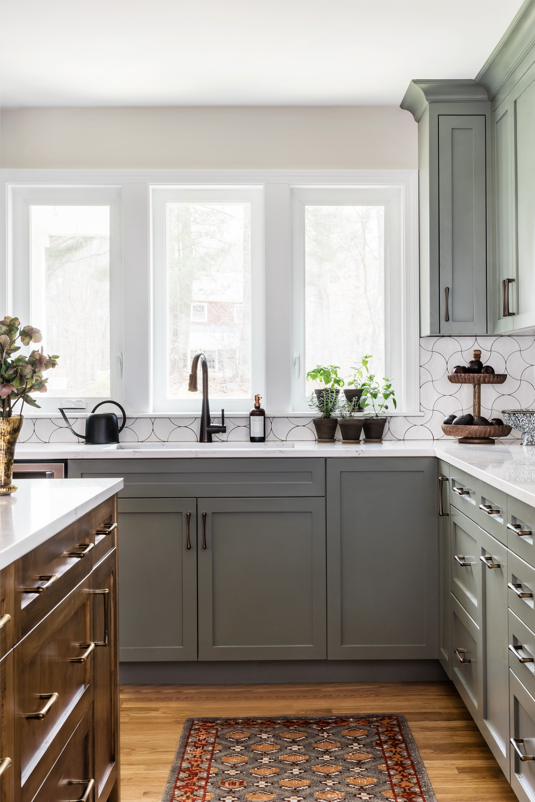 To give these homeowners a more spacious and open kitchen, their designer, Kerri Reesey, had an intriguing proposal: Flip spaces. By taking down walls and swapping the location of the kitchen with a dining area and adding a 5-foot bump-out, she was able to radically reconfigure the look and feel of the kitchen and surrounding areas. The moves more than doubled the square footage of the now-open kitchen and resulted in better circulation and more natural light. A warm and welcoming maple island creates a hub for gathering and features abundant prep space. Pine-wrapped structural steel beams and oak hardwood flooring add warmth. Green perimeter cabinets enhance the inviting style.
