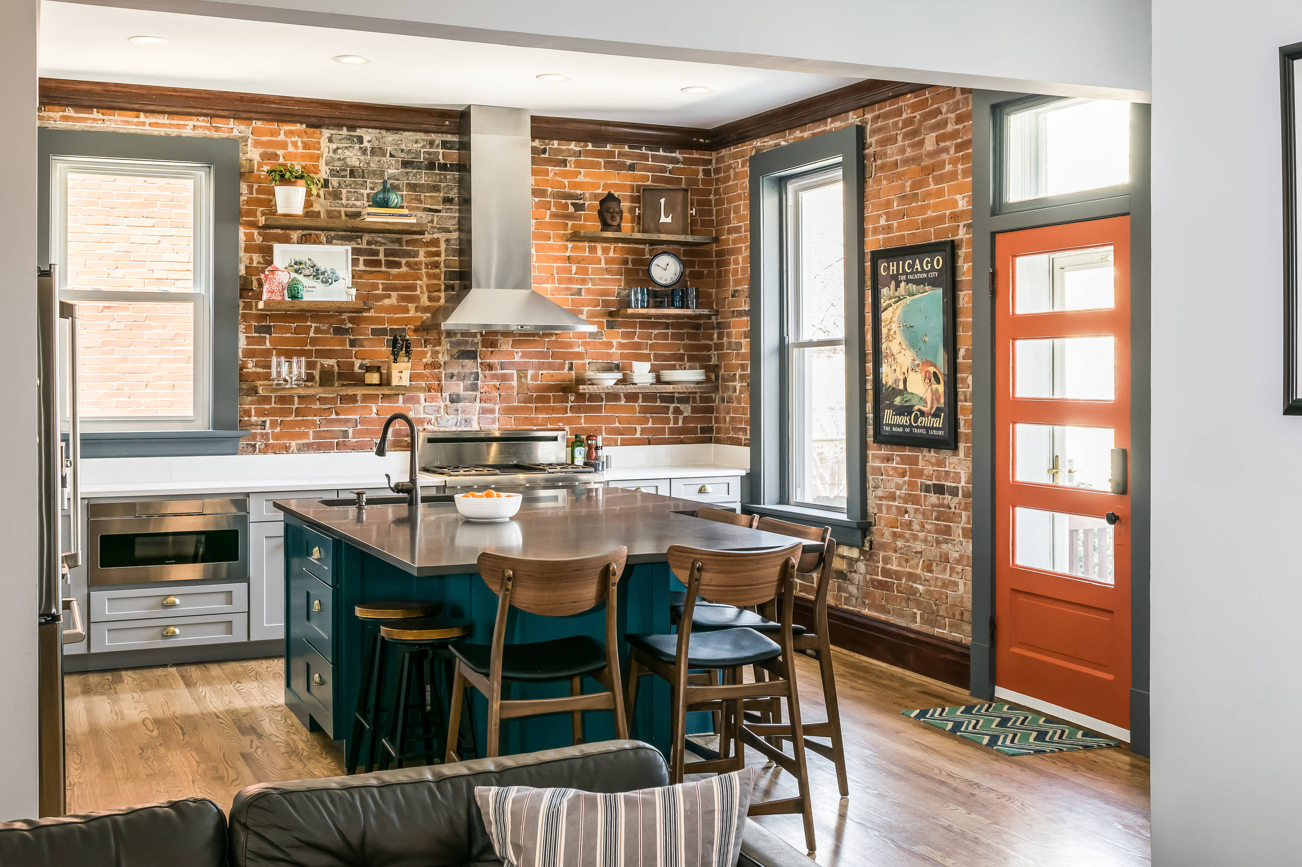 - Repeat elements in rooms that are open to each other to create connections. In this case it was the original brick, reclaimed wood and splashes of teal.