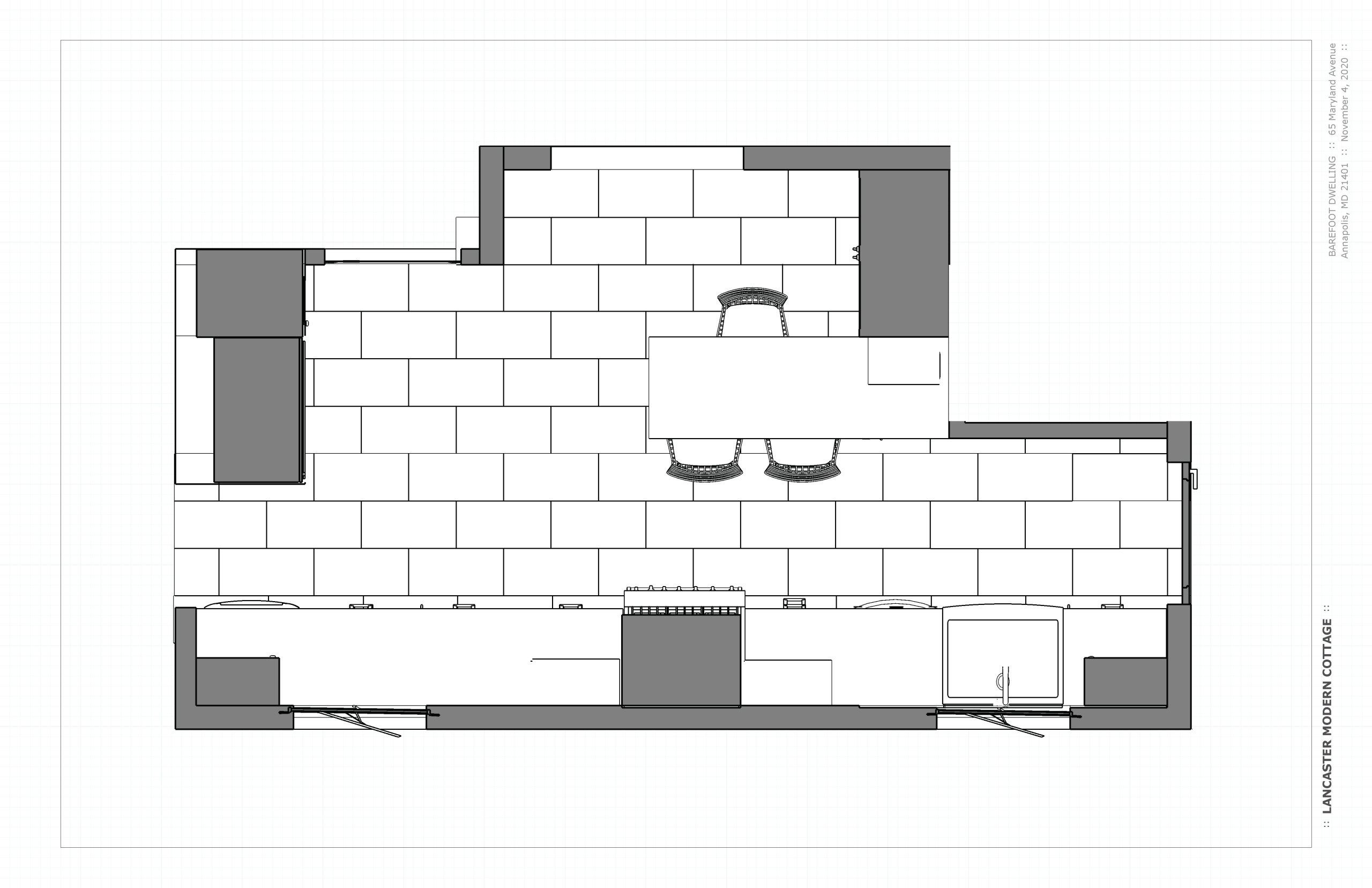 The custom walnut floating shelves were made from wood salvaged from a local boat. Durable gray quartz countertops add contrast to the cabinets and complement the dark gray porcelain floor tiles. “We do a lot of batch cooking on the weekends, so having that long countertop makes things much easier,” Bryan says.