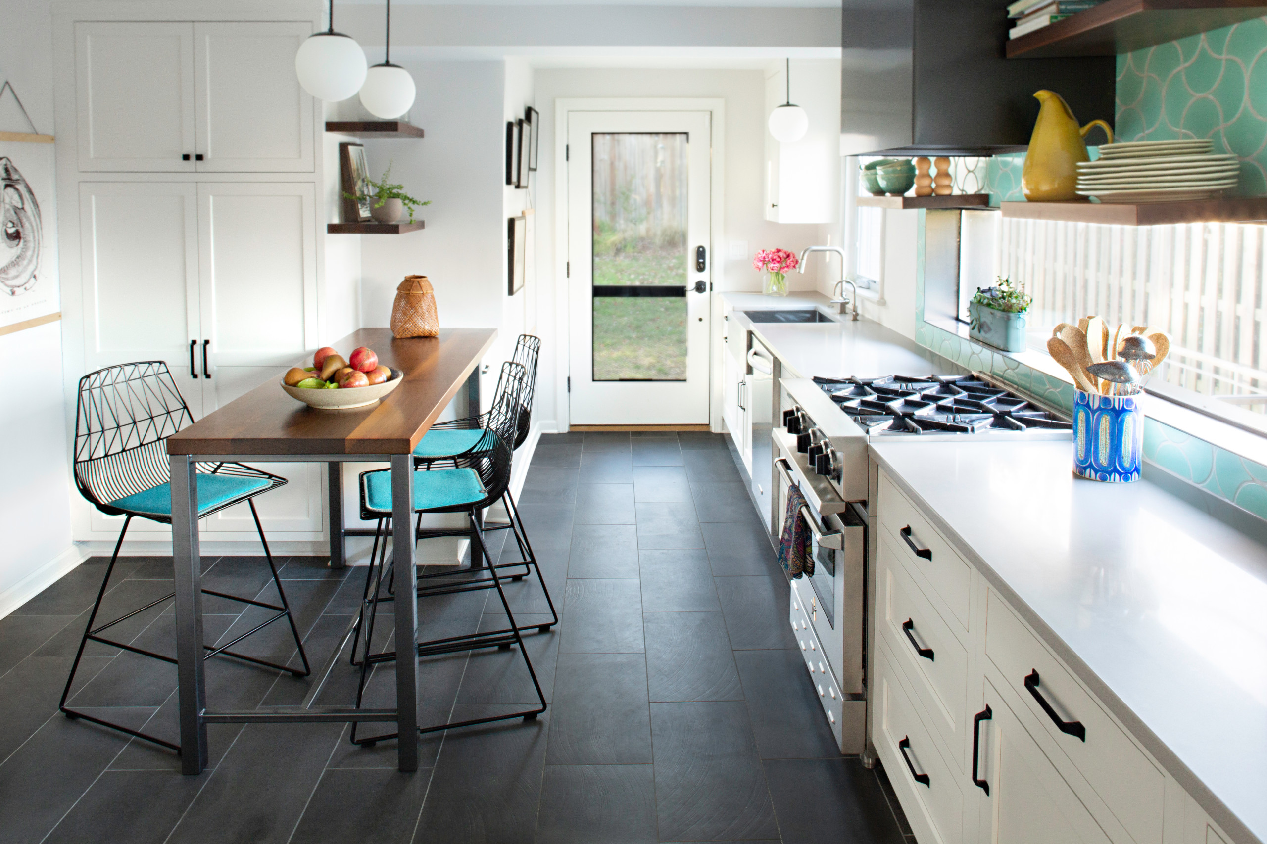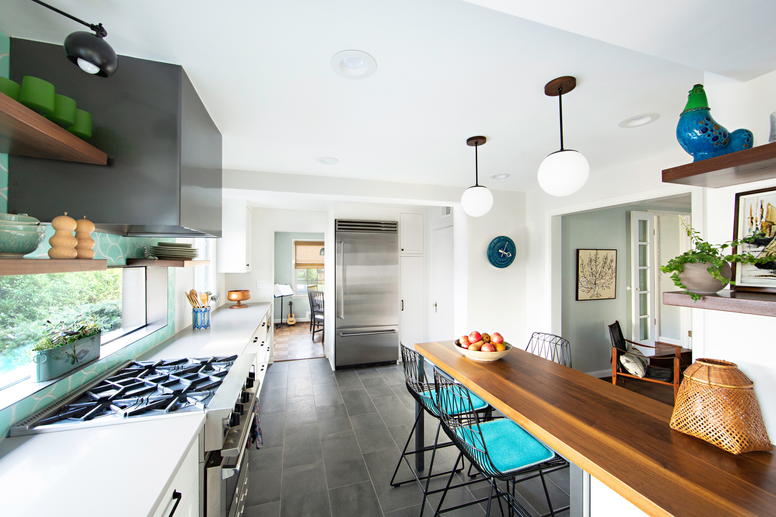 Quina expanded the size of the opening to the family room on the right for better flow between spaces, and she relocated the sink and range to the same wall on the left, where a door to the backyard once stood.