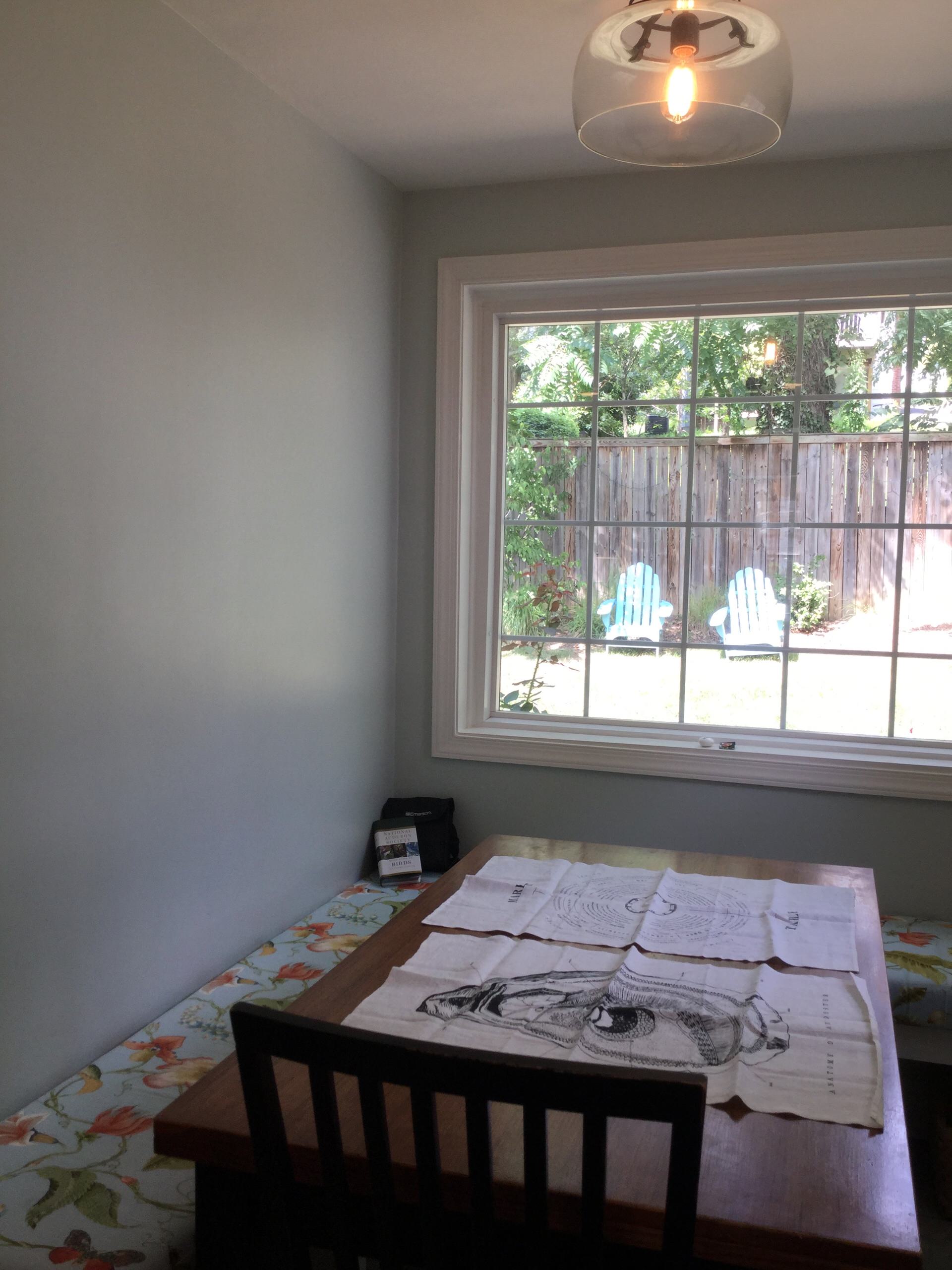 Before: This photo shows the old breakfast nook with a built-in bench, a standalone table and a large window that overlooked the backyard. “We were worried about losing that window,” Bryan says.
