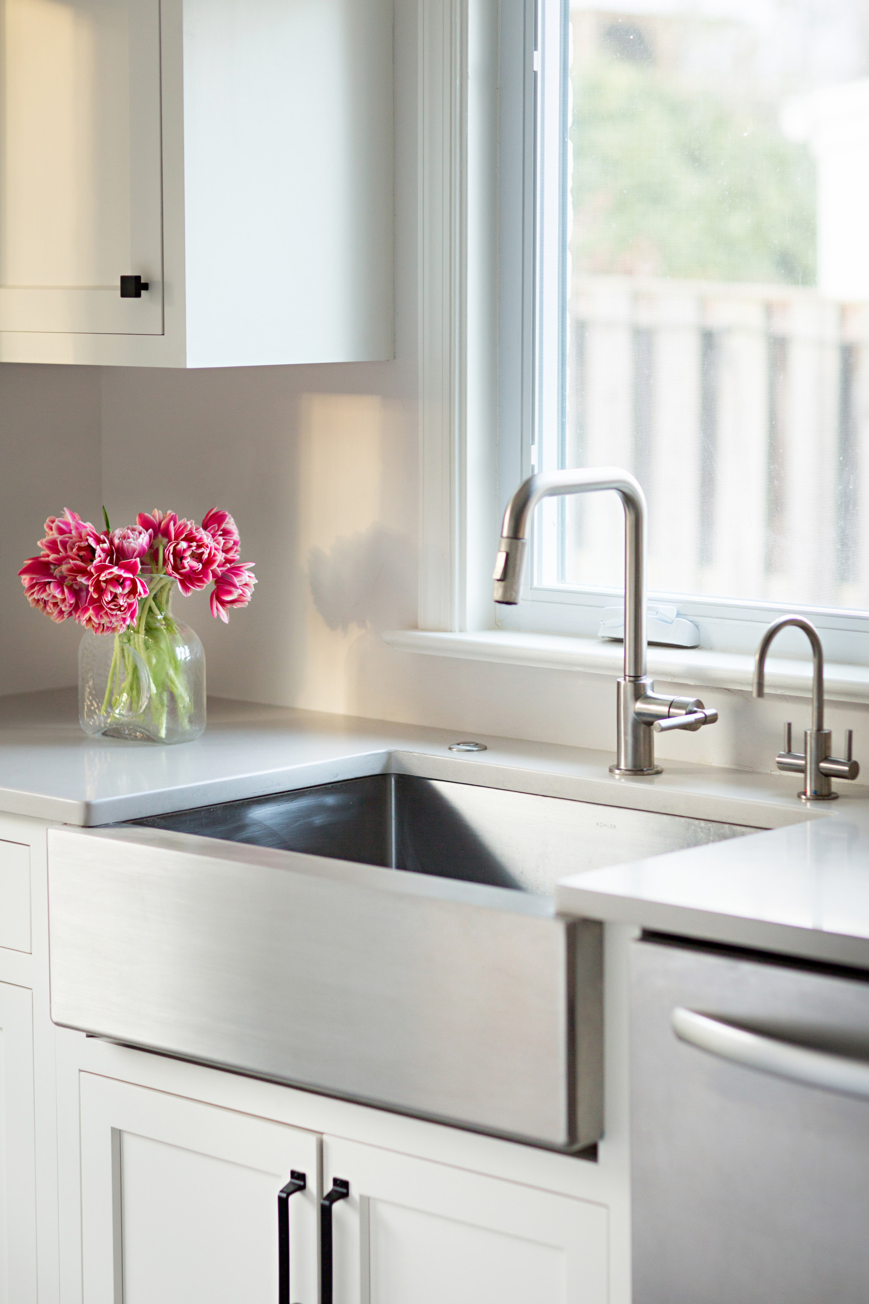 Quina gave the sink area a modern industrial look with a stainless undermount single-bowl farmhouse sink, a single-handle pull-down faucet with clean lines and an instant hot water dispenser that the family loves. “In the phase-one part of this home renovation, we added modern industrial elements, so we didn’t want a white farmhouse sink,” Quina says. “We wanted to go a bit more industrial. We were very intentional throughout the house introducing the industrial and metal elements.”