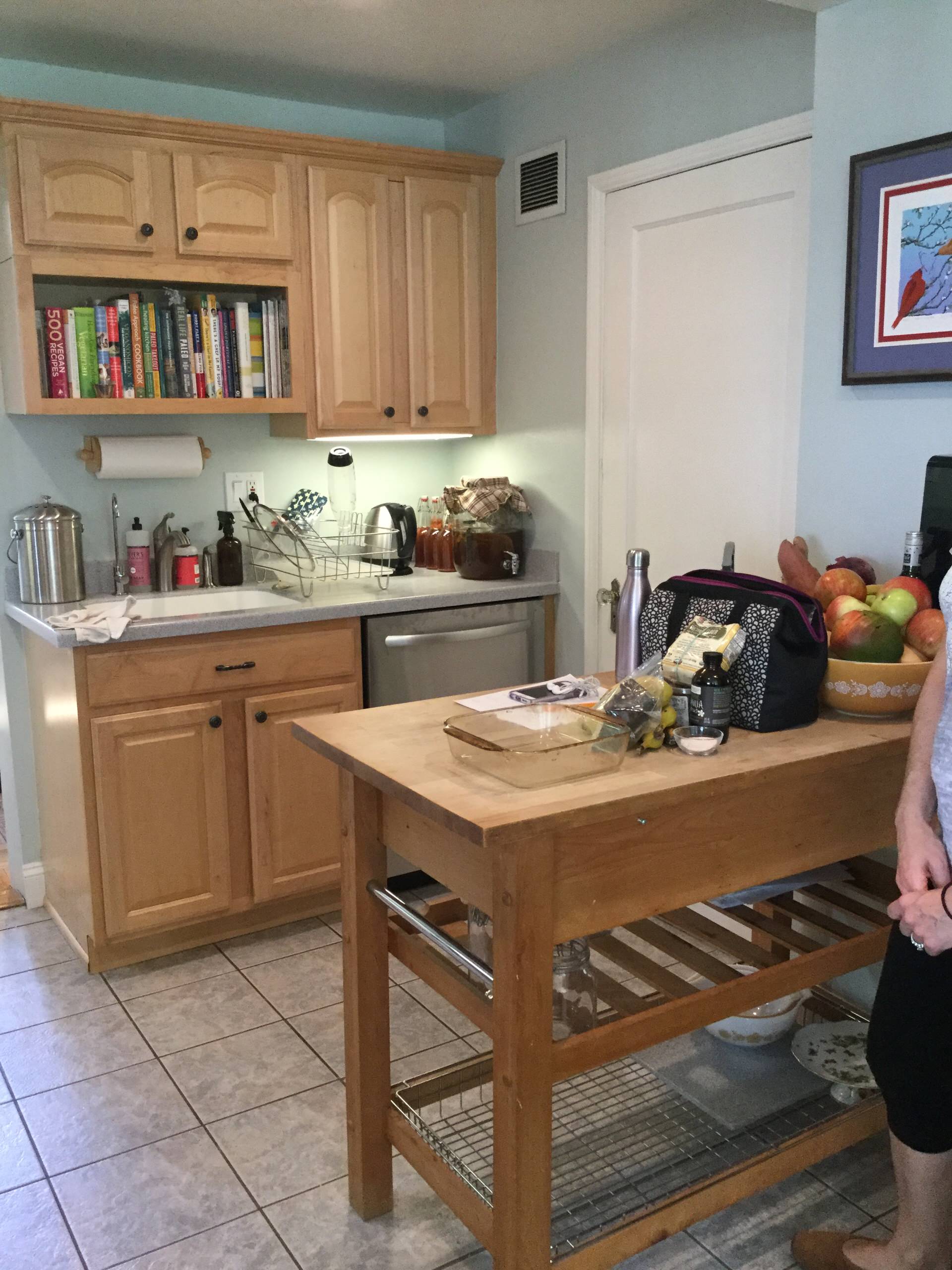 Before: This view of the former kitchen shows the tight layout, basic oak cabinets and limited countertops, as evident next to the sink shown here. Previous homeowners installed the blue-brown tile, resulting in an uneven floor. A freestanding wood table provided some extra work surface and storage.