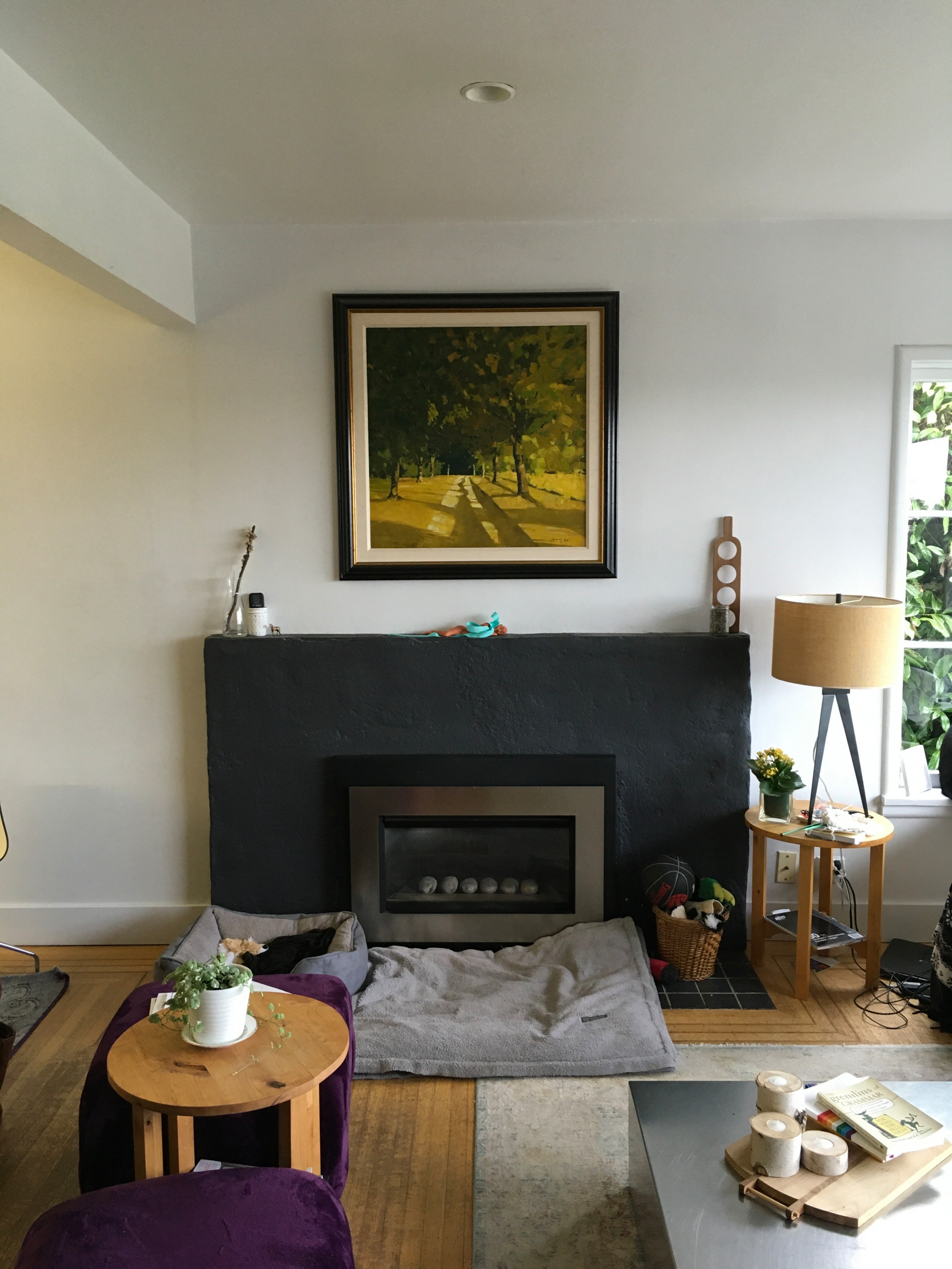 Steeves had the existing fireplace insert painted black, blending it into the surround by installing black tile around it. “The fluted terrazzo tile from Ann Sacks was the one big splurge the husband really wanted,” Steeves says. It was an excellent way to honor to the home’s original midcentury architecture.
