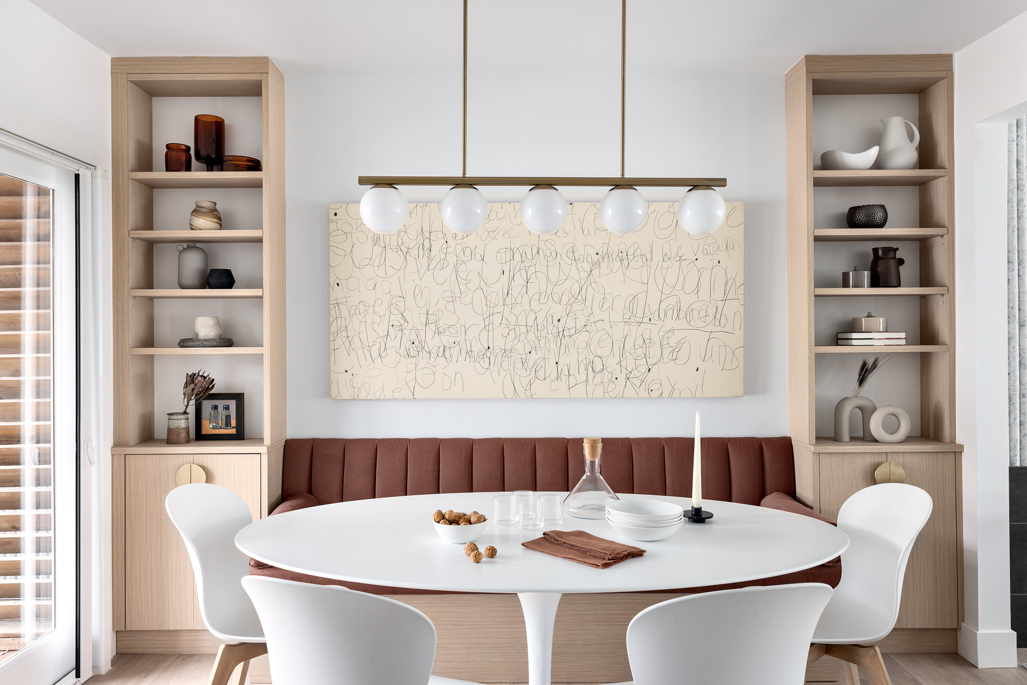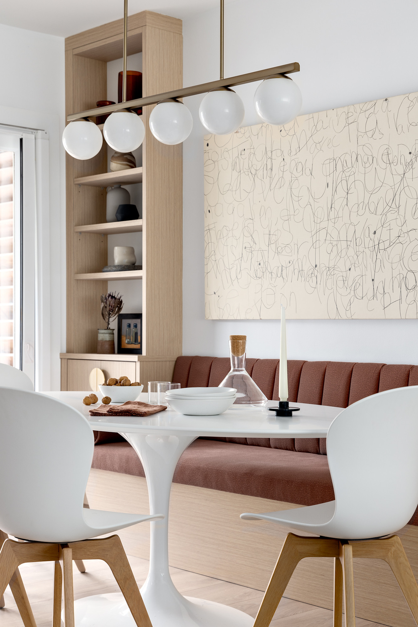 The modern-looking artwork behind the banquette is the homeowners’ kids’ art. “They had written a lot of letters and words on a big canvas. My clients loved the graphic quality of it and it was perfect for this spot,” Steeves says. She made sure to choose a light fixture that would keep the view of the artwork open. This one, a simple brass bar with globe lights, references midcentury modern design in an updated way.