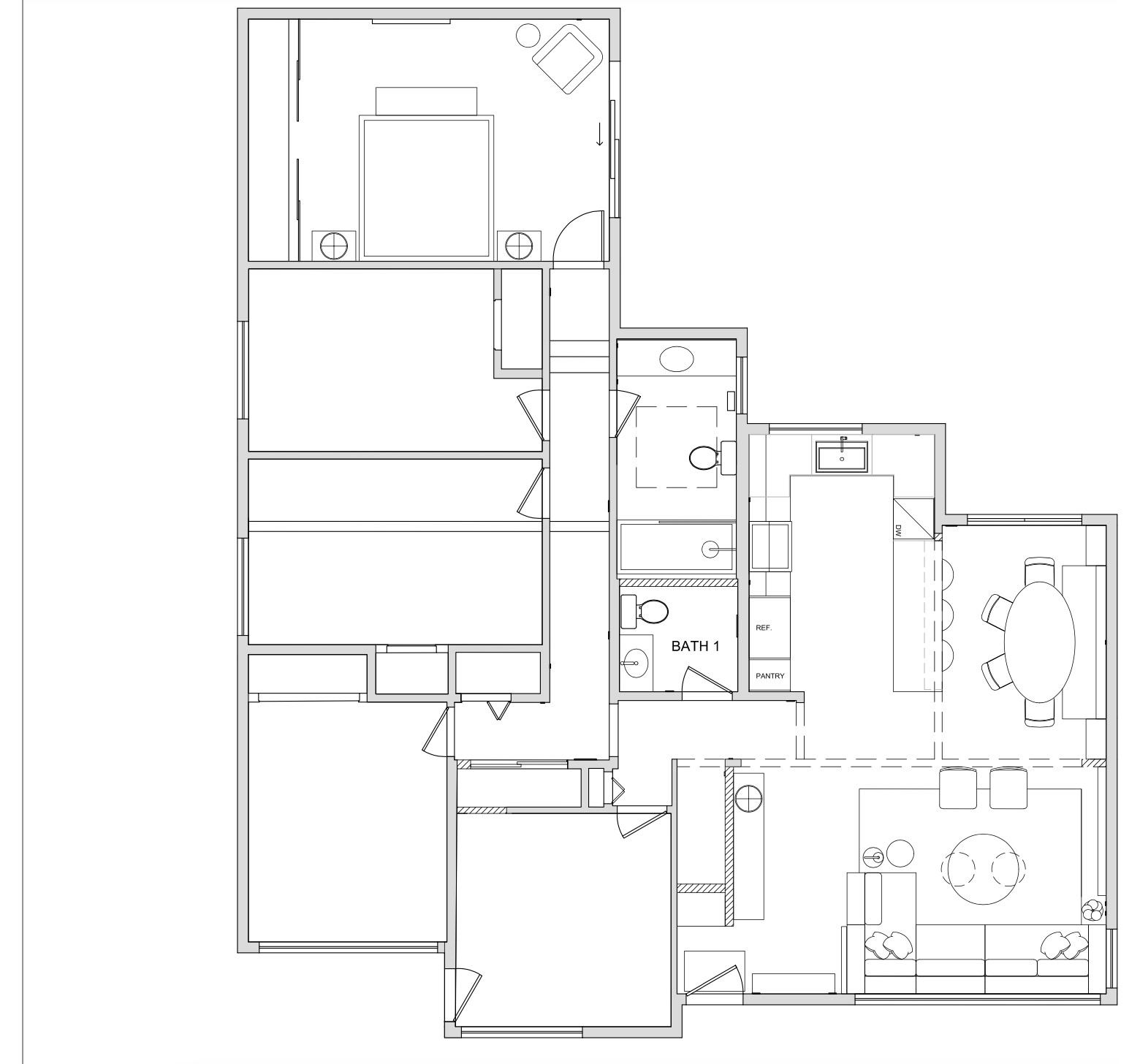 First floor after: This plan shows the living room on the bottom right corner with the entry door to the left of it. Directly above that door is the new wall around the basement stairs, and the teak cabinet is to the right. The kitchen and dining area are above the living room. This plan shows the easy flow between entry, living room, kitchen and dining area.