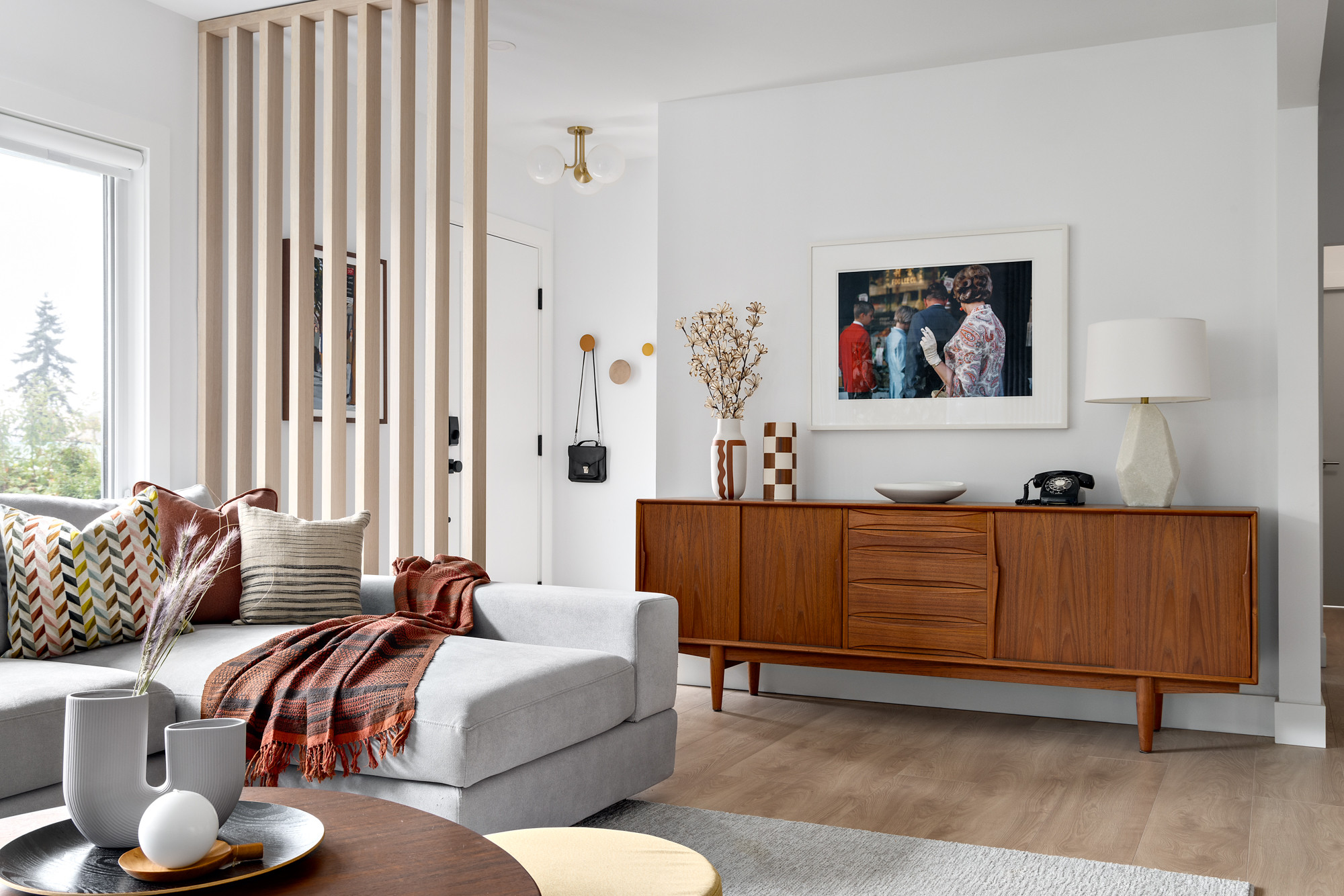 “I wanted to create contrast to the dark color of the teak on this piece, as well as some other midcentury walnut pieces that they had, with pale wood,” Steeves says. The base of the material palette is two tones of wood: dark teak and walnut contrasted by much lighter white oak. The new floors, kitchen cabinets, dining room built-ins and the new slatted divider at the entry are white oak.