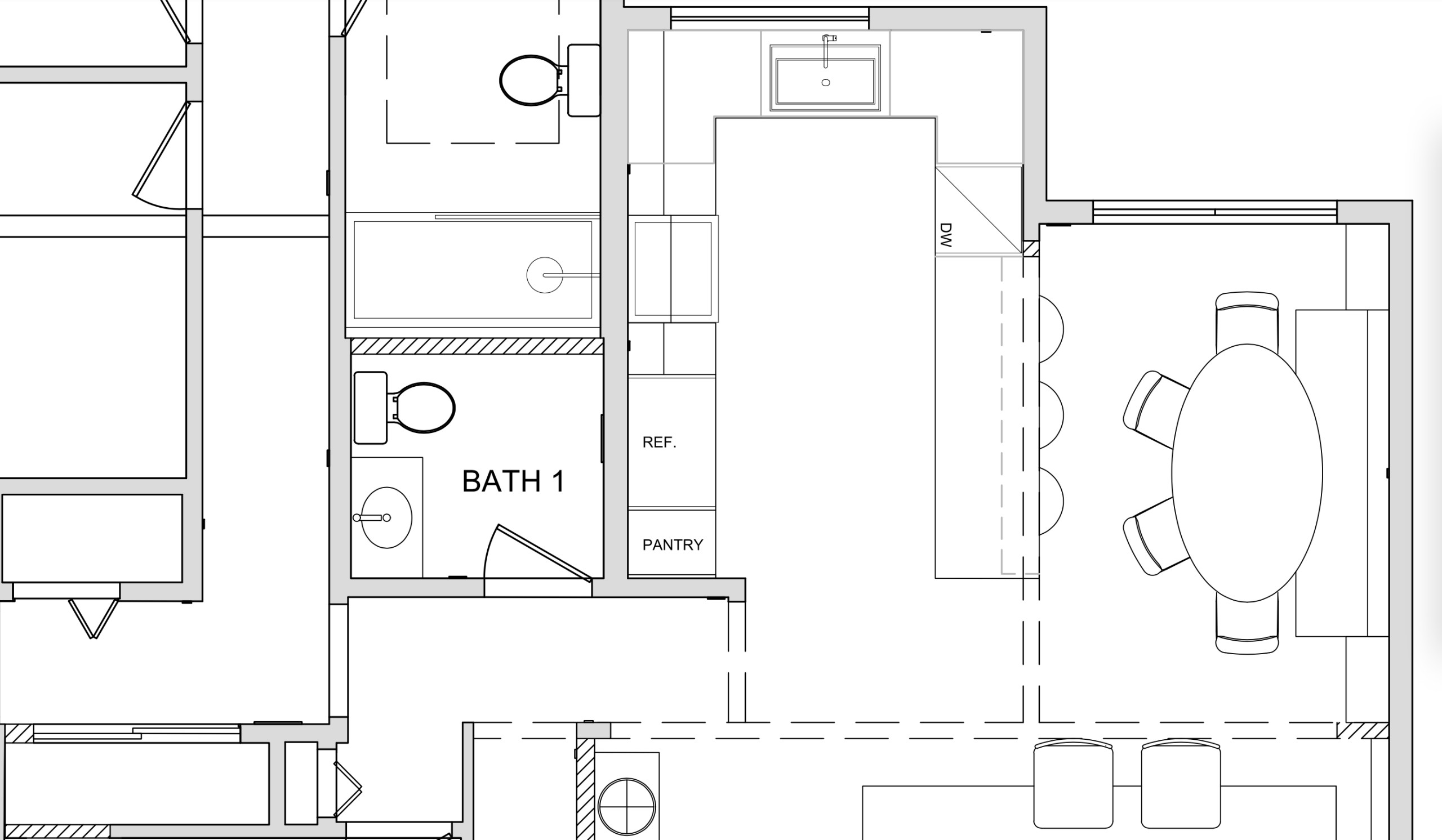 Before: Here’s a closer look at the previous kitchen and dining areas. The kitchen is in the center, with the dining area to the right. The kitchen window was only 1 foot from the wall to its left. The island position made flow through the open plan awkward.