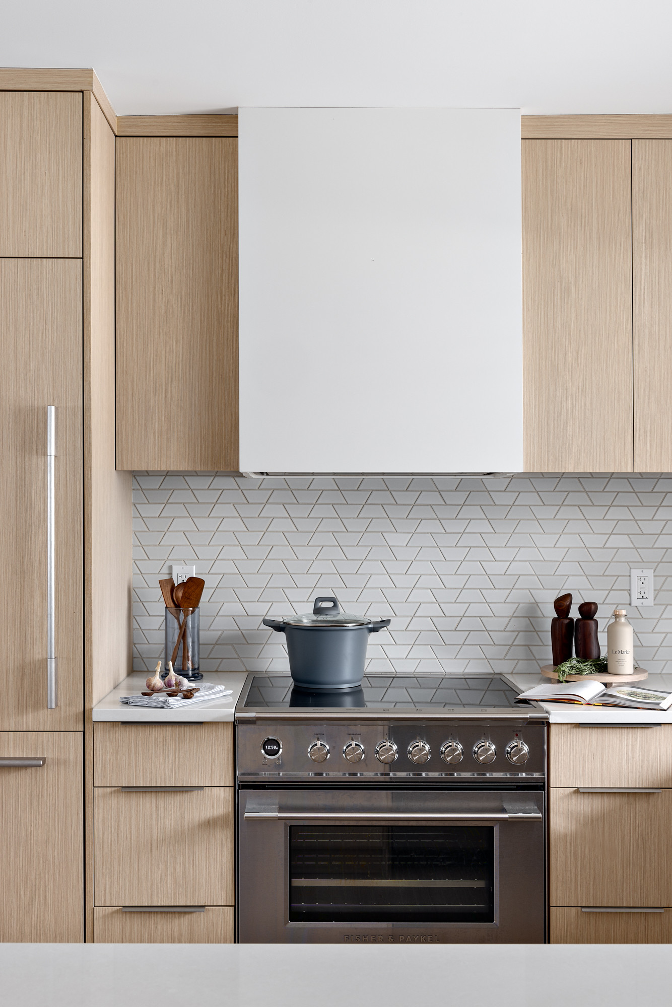 The appliances are by Fisher & Paykel. The stove has an induction cooktop. The vent hood is custom and maintains the simple, minimalist look. It’s crafted of painted MDF.