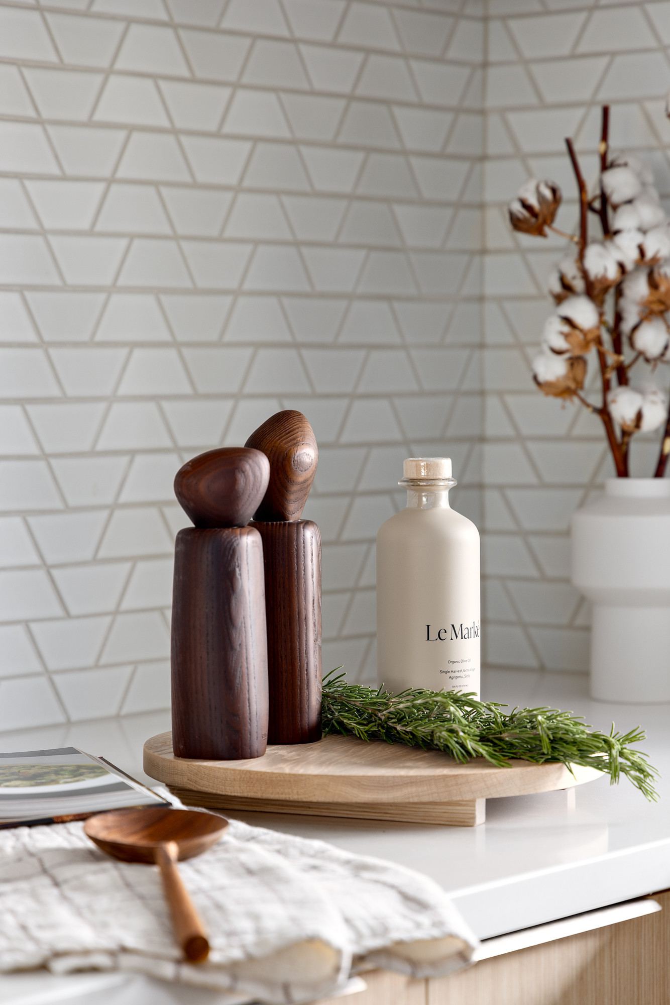The countertops are another quiet element in the room. They are Organic White Caesarstone, a durable engineered quartz product.
