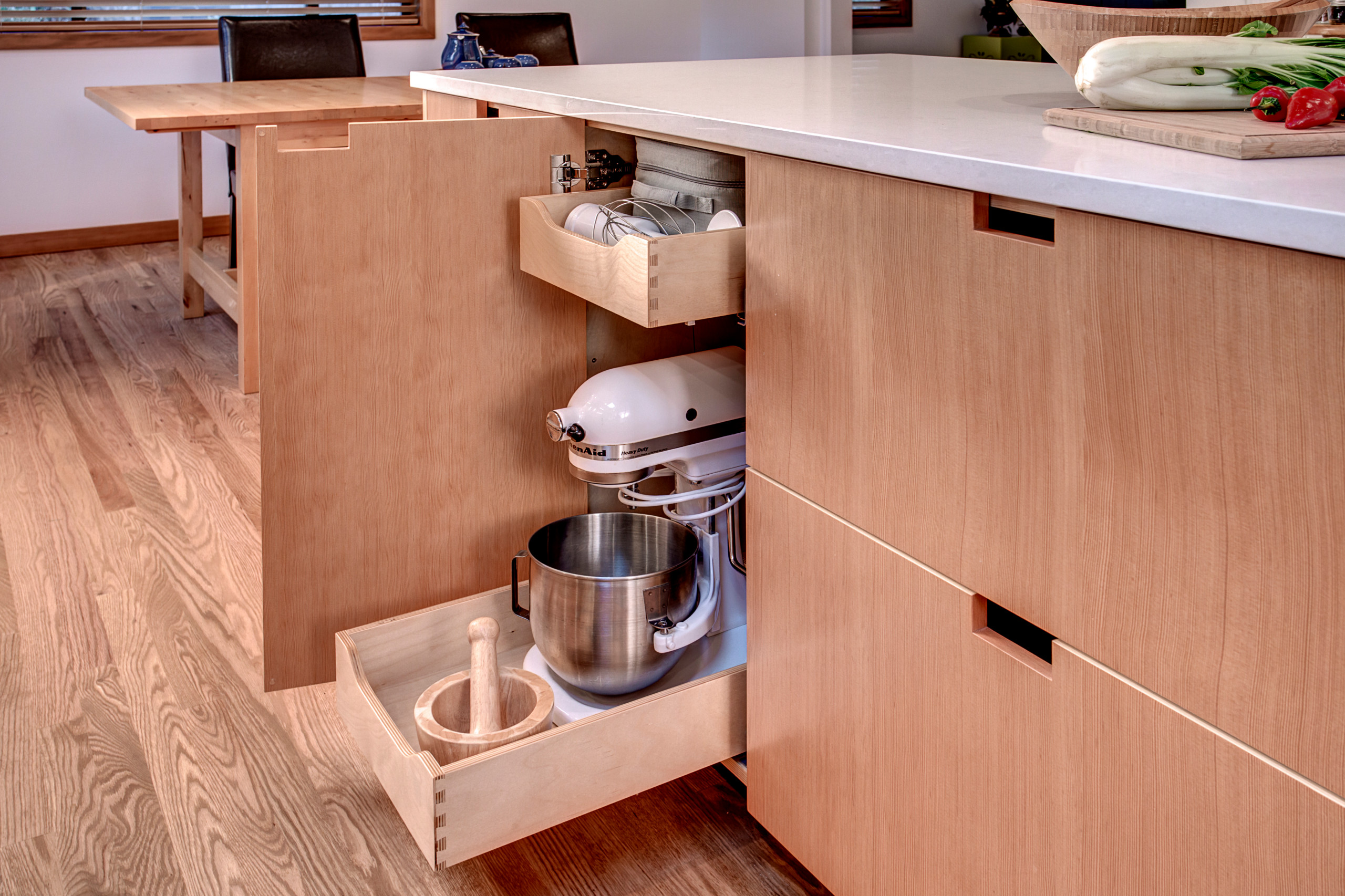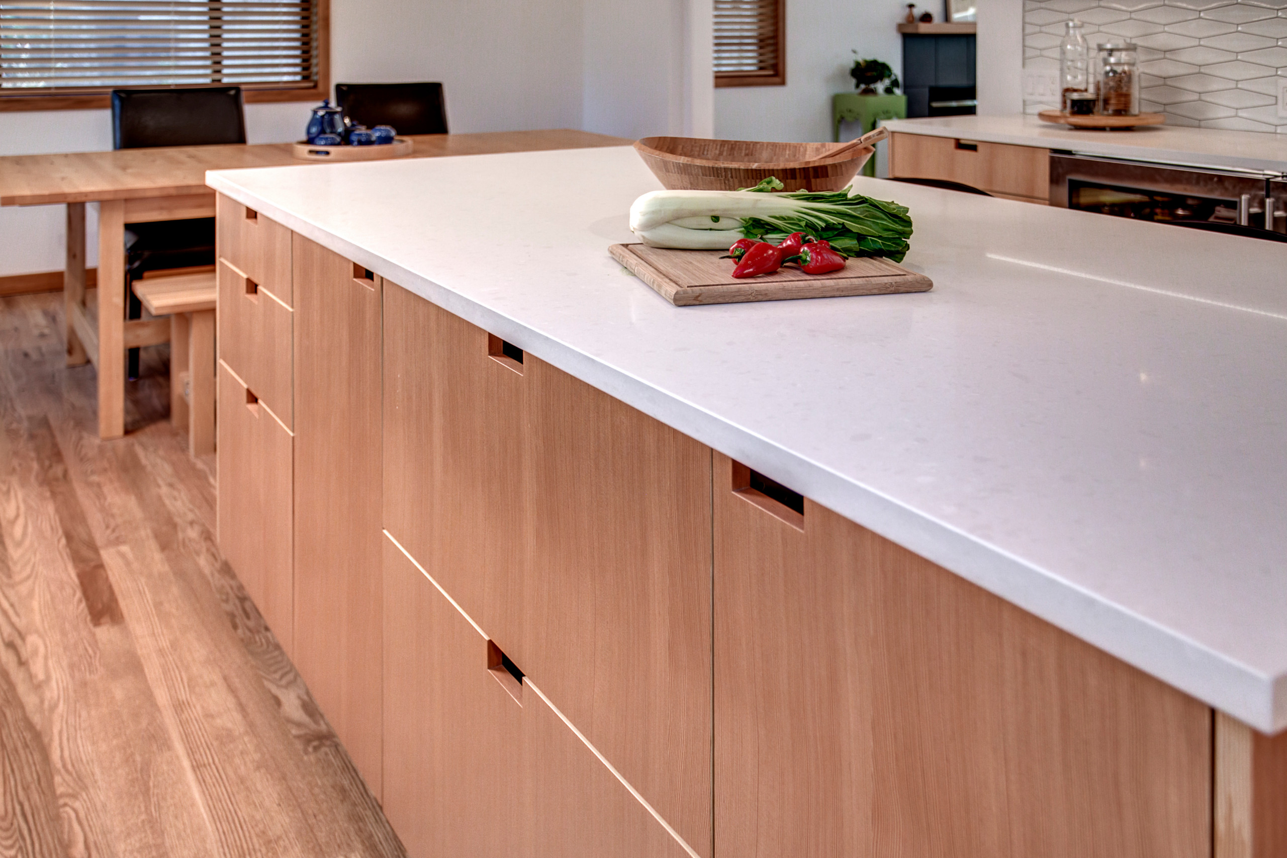 For the island, the designers continued the look of the rest of the kitchen’s finishes with smooth fir cabinetry and a Caesarstone quartz top in Organic White. There’s a spacious work surface, ample storage for tools and appliances, and seating for family members who visit while meals are being prepared.