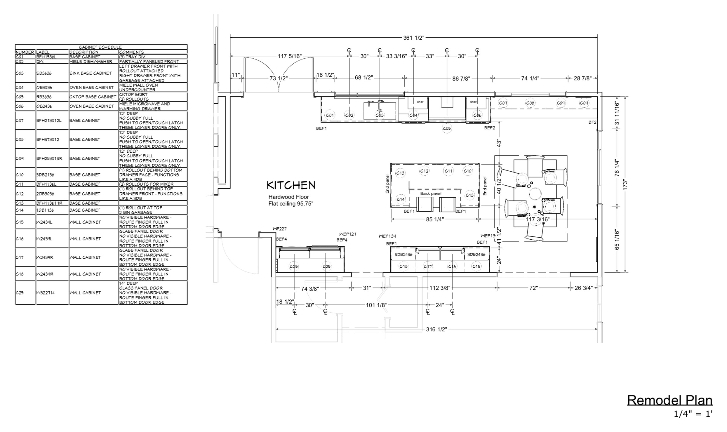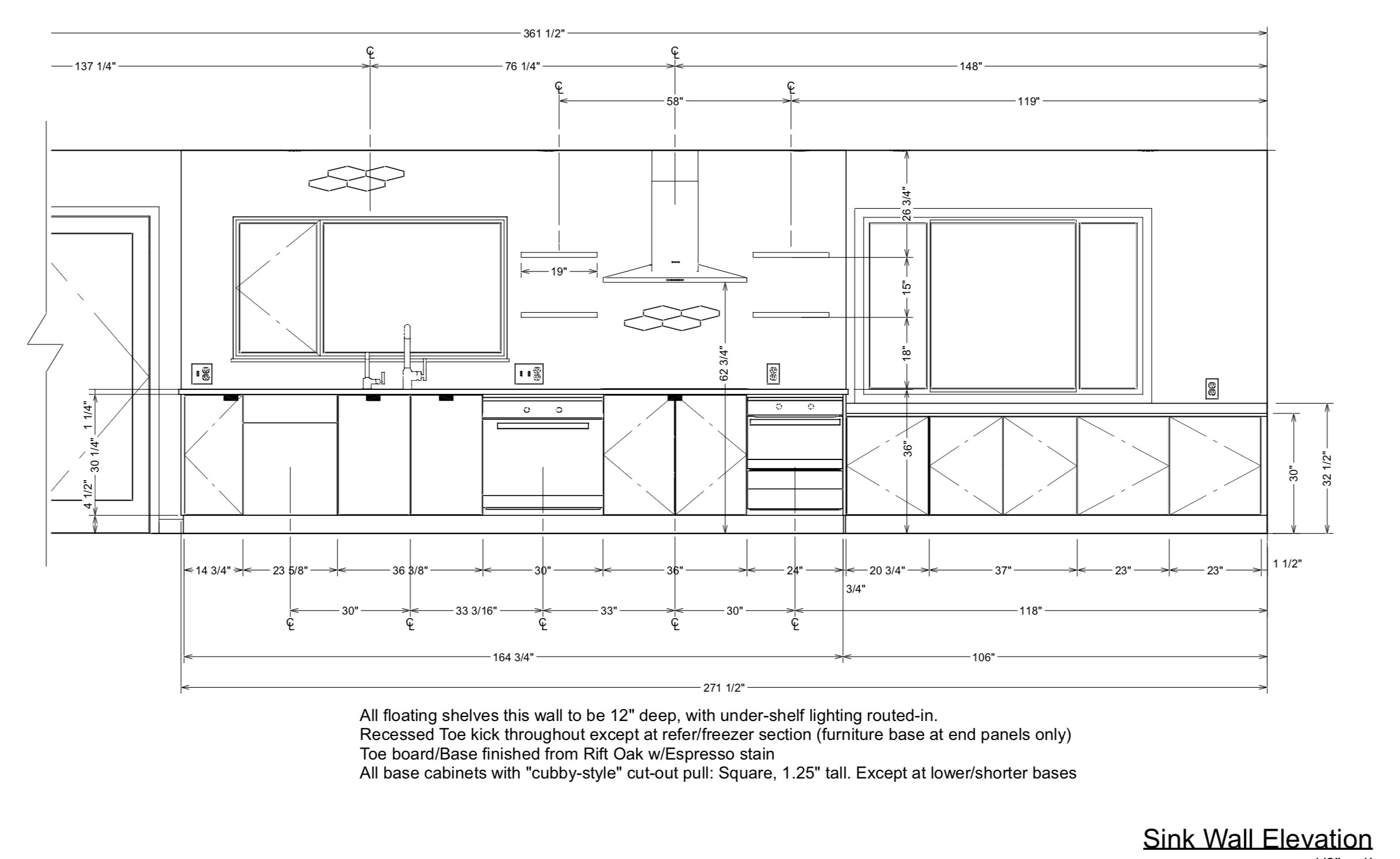 Here are measurements for the cabinetry and appliances on the wall with the sink and enlarged window.