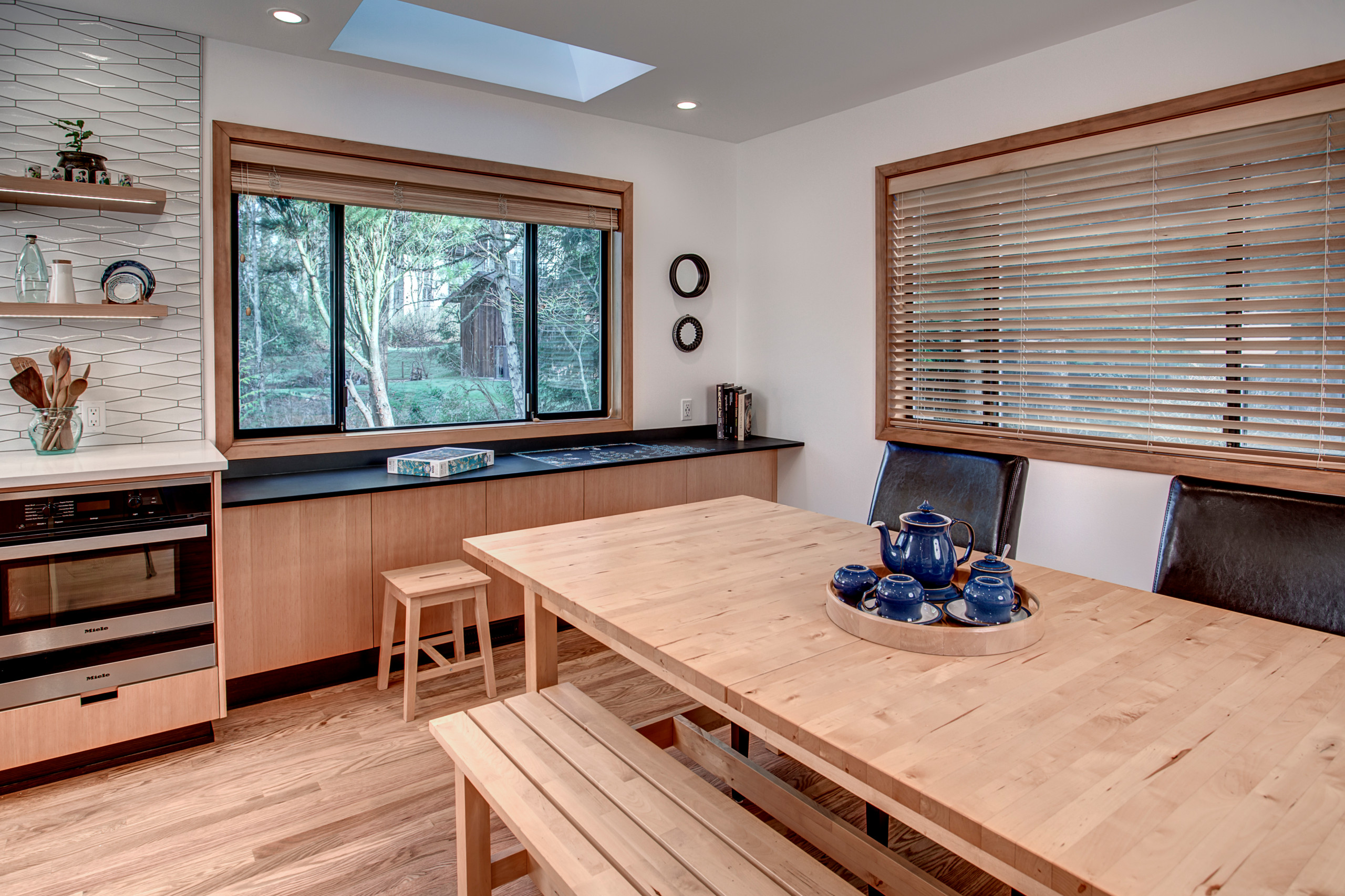 The dining area of the kitchen fulfills the homeowners’ wishes for a more functional space. Before the renovation, for large family gatherings they would have to drag the dining table into the living room. Now the entire table fits in the kitchen. A table-height bar counter of PaperStone, a stone-like product of recycled paper and resin, runs under the original dining room window and is a multifunctional spot used as a desk for puzzles and projects, as well as extra seating and a buffet when entertaining.