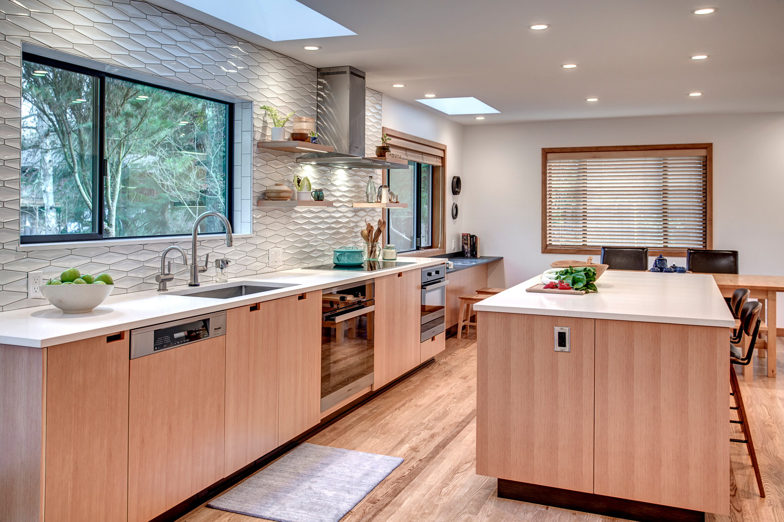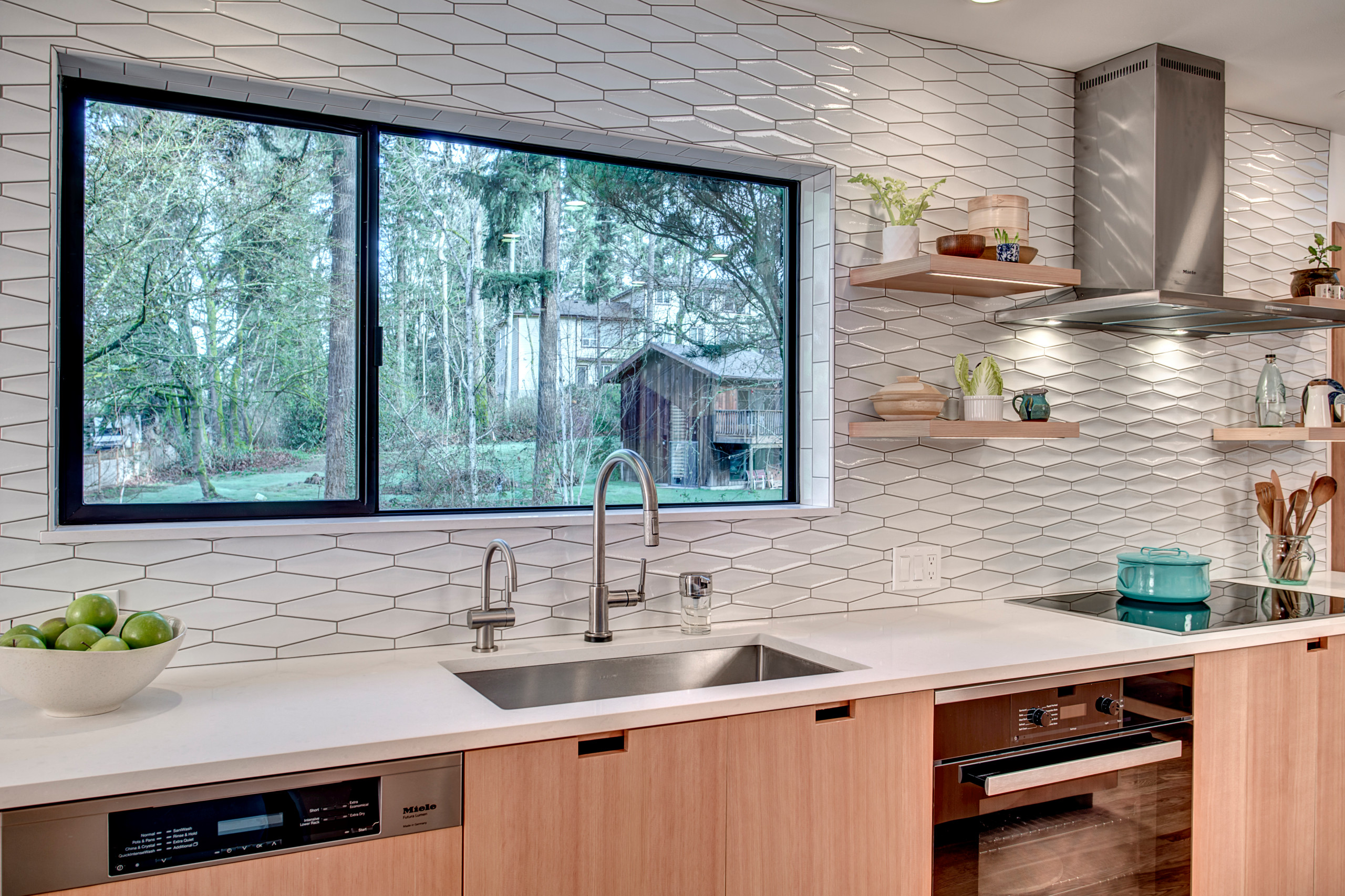 The window that was replaced and enlarged offers a view of a creek in the backyard. The designers chose subway tile trim in the window frame to complement the backsplash tile. A stainless steel undermount sink and sleek fixtures that include a hot-cold water filtration faucet round out the modern aesthetic.