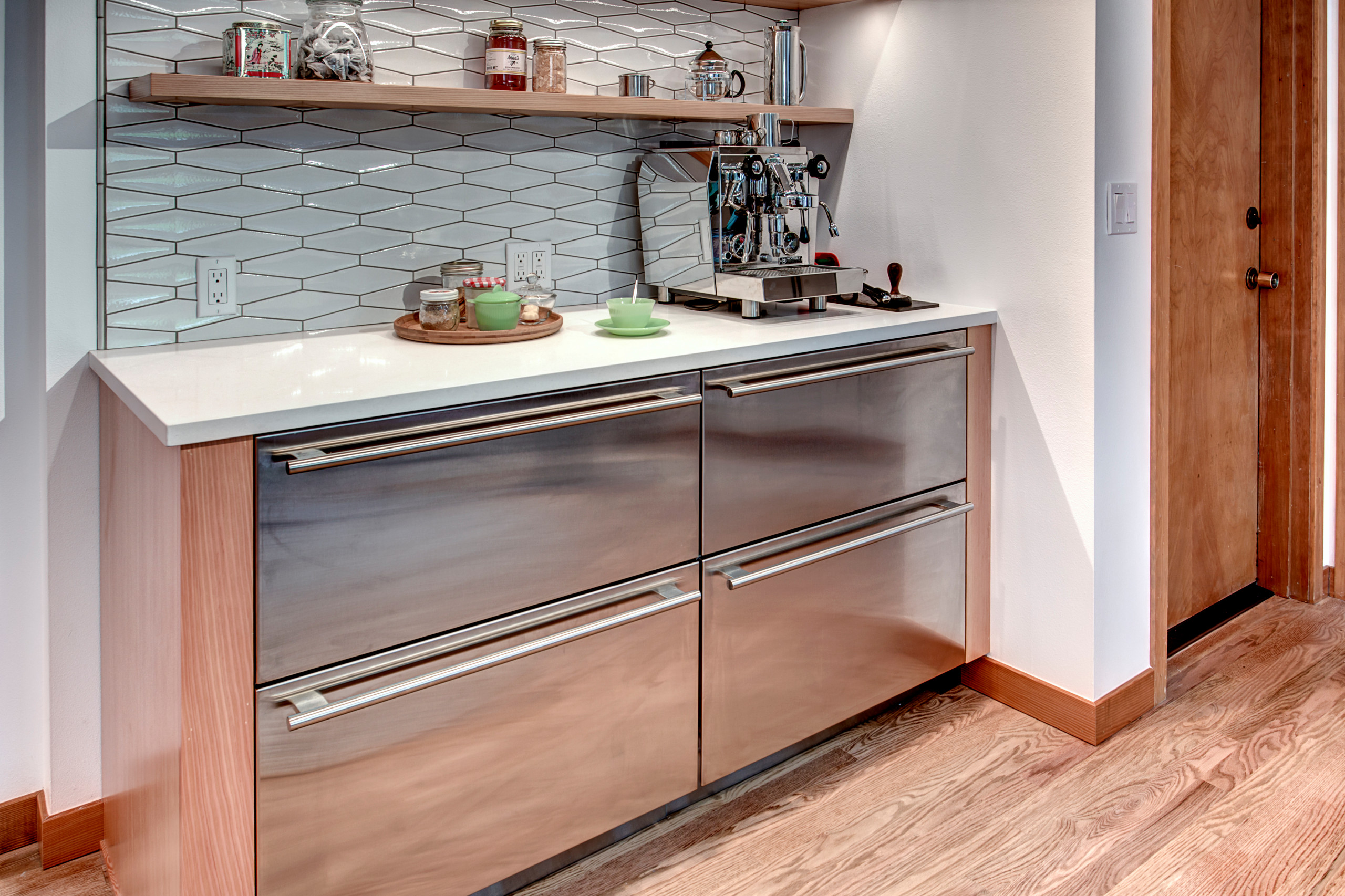 A cabinet with a coffee station and open shelving and cabinet above it for drink supplies contains the double-drawer refrigerators on the left and freezers on the right.