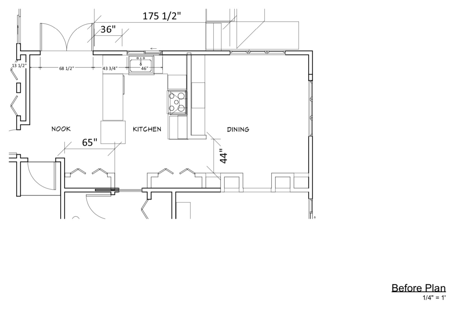 These floor plans of the kitchen’s previous layout (above) and the remodel plan (next image) show how the space was opened up by combining the nook, kitchen and dining room.