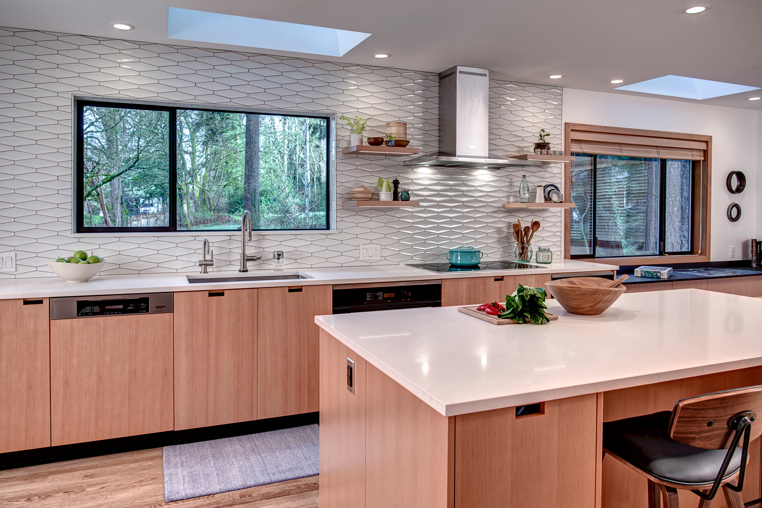 After: The team installed an induction cooktop, which is powered by electricity and uses copper coils to evenly heat cookware with a magnetic current. Glossy elongated hexagonal porcelain tile on the backsplash reflects light and provides a burst of artistic flair. The tile installers used urethane grout on the backsplash to make it easy to clean. Floating shelves made of vertical-grain fir keep fresh items at hand when cooking, and LED lights underneath them further brighten the space.