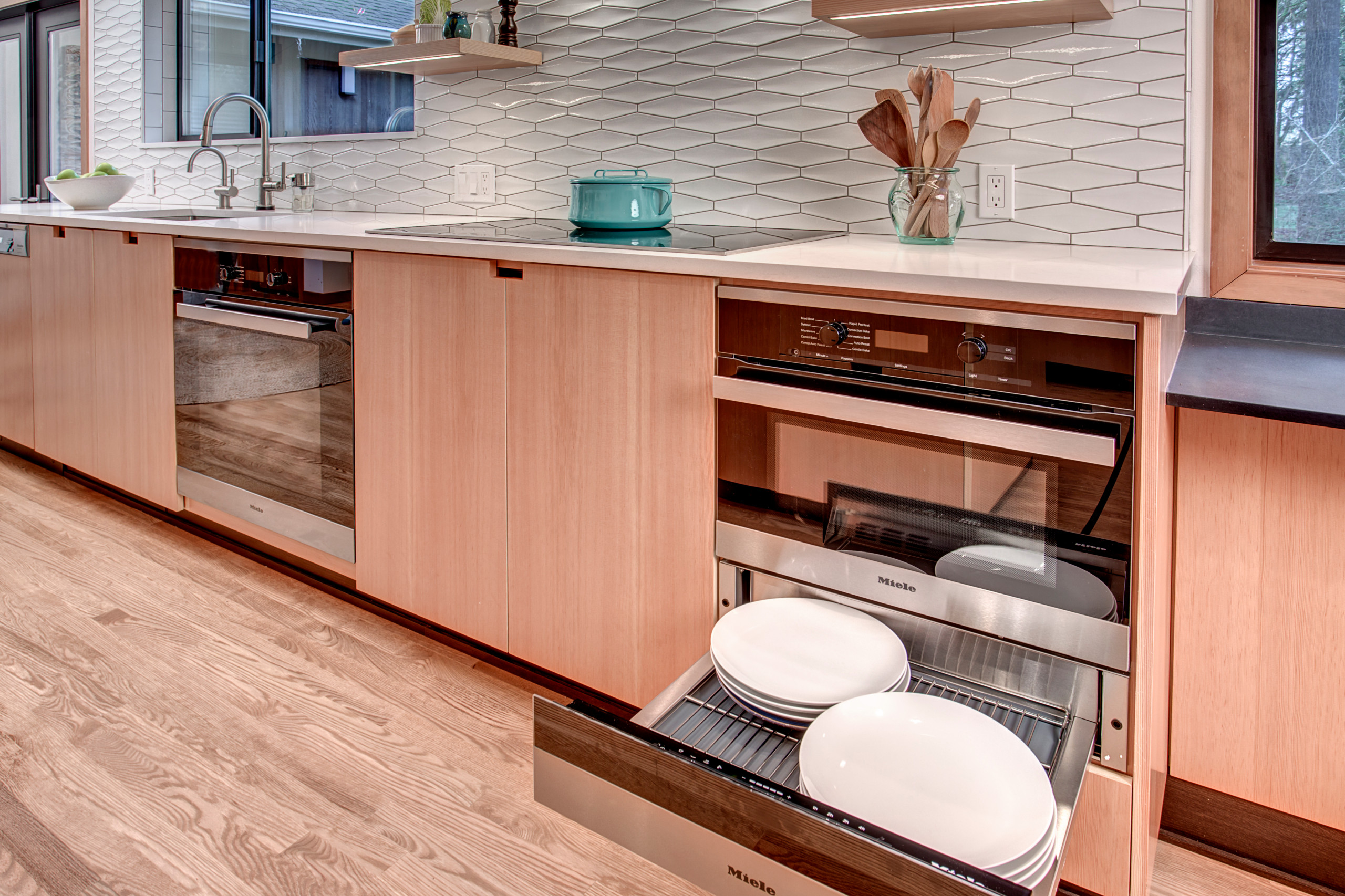 The team created a sleek and smooth wall of fir cabinetry with built-in appliances that include a dishwasher, a speed oven and a base oven with a warming drawer, all from Miele. The speed oven combines the features of a full oven with a microwave. Nip Tuck’s cabinet supplier created the wood panel on the dishwasher, leaving room at the top for the controls. The toe kicks were painted a dark color to correspond with the black aluminum window frames and black-framed French doors.