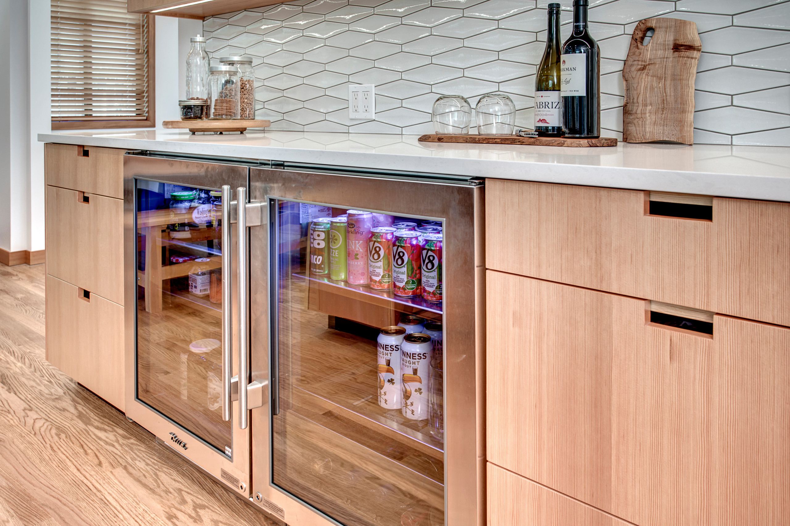 Bettinger says the homeowners were adamant about having no traditional tall refrigeration or pantry, so the team opted for undercounter refrigerator and freezer drawers and two built-in beverage refrigerators. Here’s a view of the kitchen’s mix of closed and glass-front cabinetry, with the beverage refrigerators on the left and refrigerators and freezers on the right. The view through the doorway is to the home’s entry.