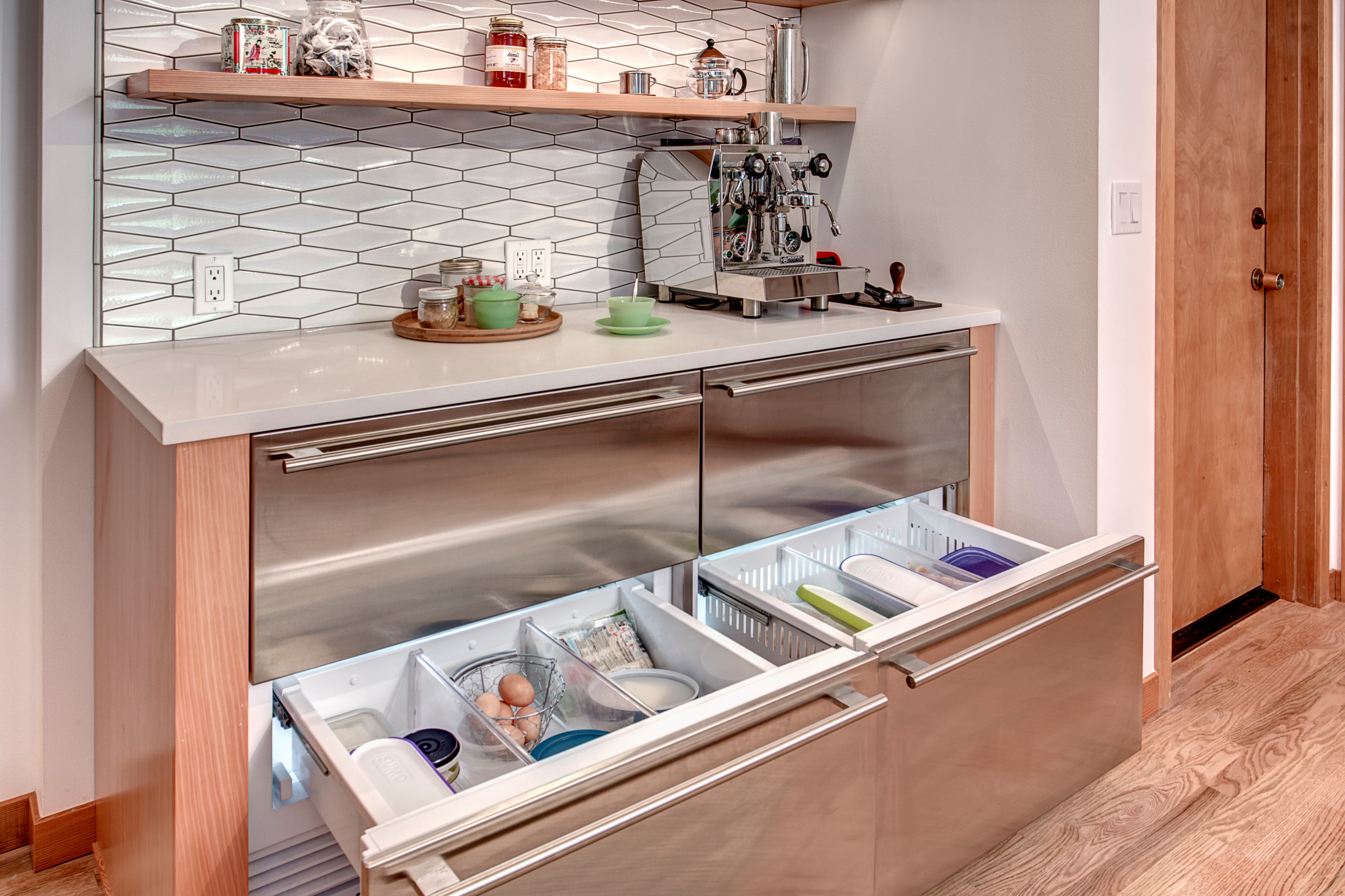 The pull-open refrigerator (left) and freezer (right) drawers have plenty of capacity for daily food needs, Bettinger says.