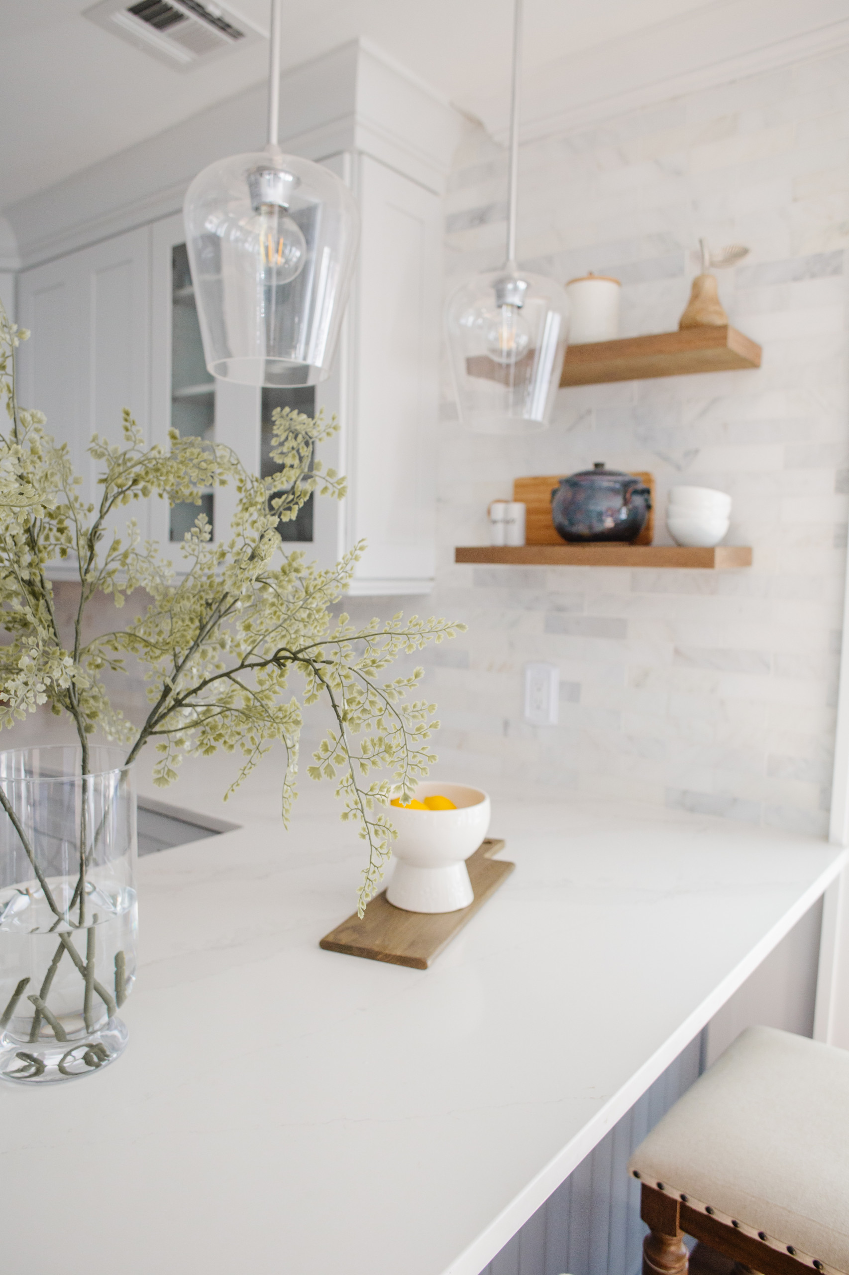 A pair of transitional-style single-jar pendant lights with a brushed nickel finish hang over the peninsula. Lankiewicz also added LED ceiling lights.