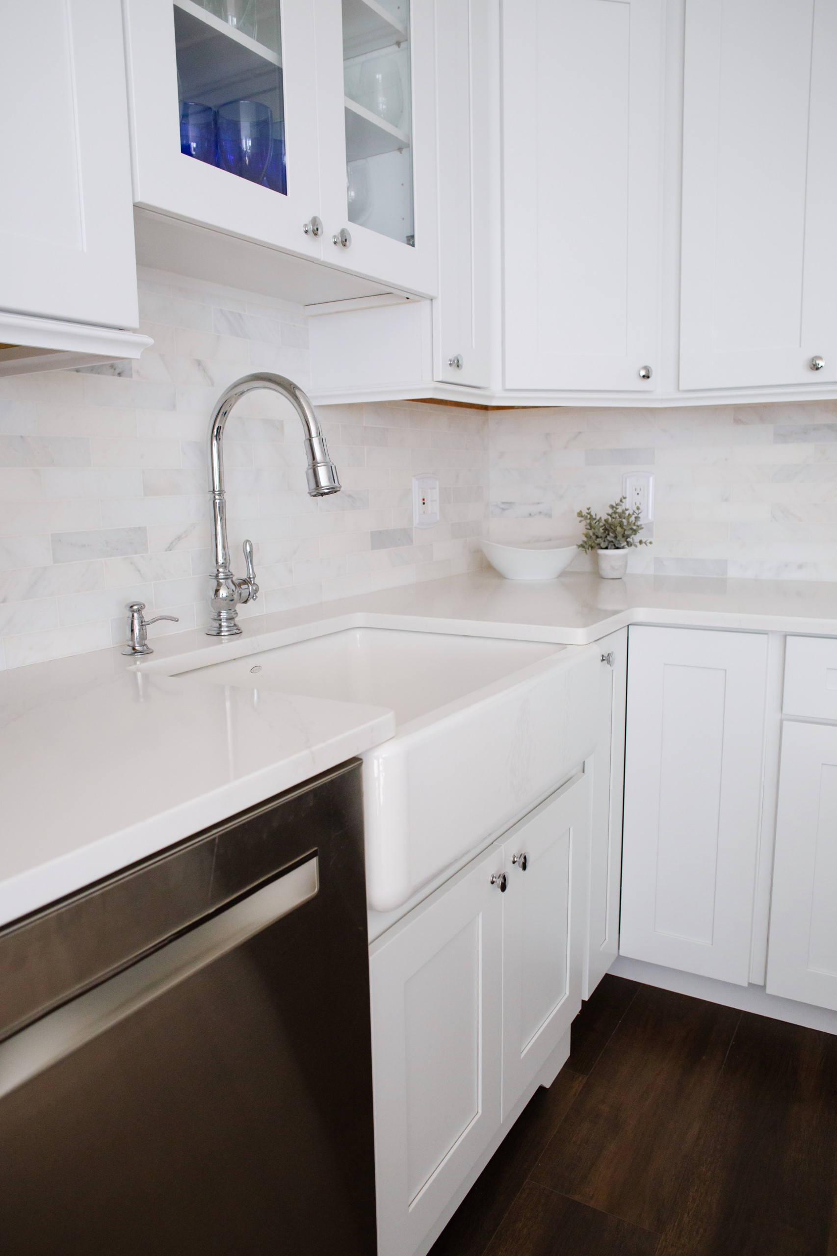 White Shaker-style cabinets and a marble tile backsplash (a homeowner splurge) give the kitchen a fresh look. “I wanted to do everything light and bright,” Lankiewicz says. “All of the kitchens she showed me had white cabinets, and it’s a classic look.”