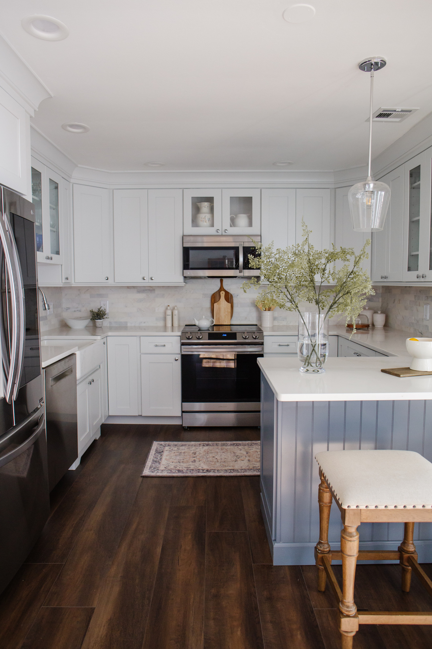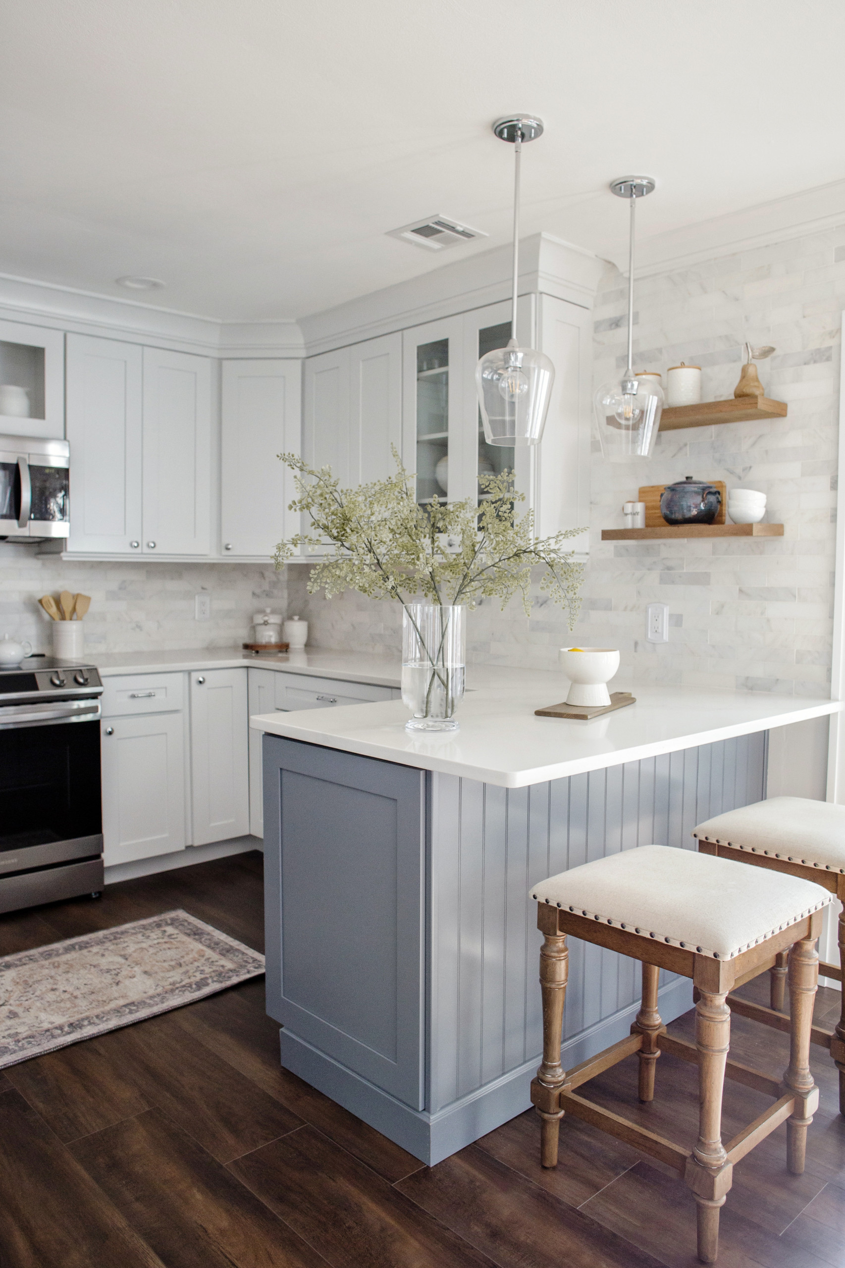 The new peninsula features a blue-gray cabinet factory finish that offers contrast to the lighter walls and cabinets. Beadboard paneling on the back and a Shaker-style panel on the end add texture and visual interest.