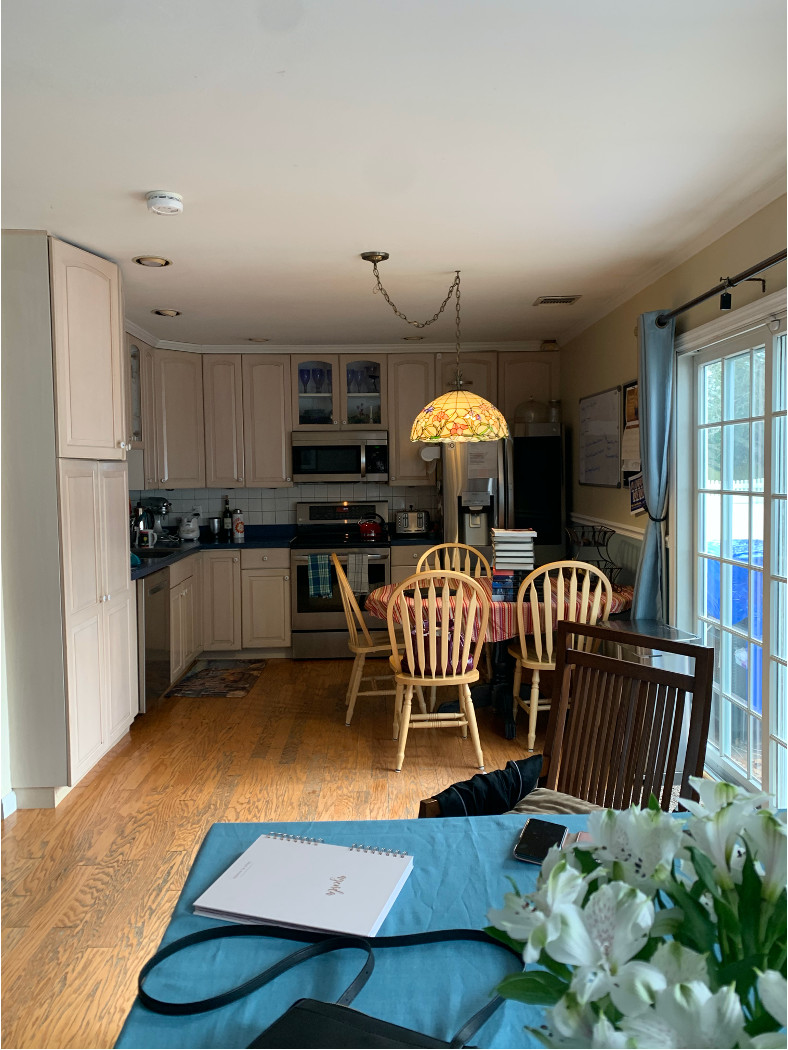 Before: In the previous kitchen, the fridge in the righthand corner and a breakfast table in about the middle of the layout gave the space a cramped, cluttered feel. Meanwhile, fading white cabinets, dark blue laminate countertops, a beige tile backsplash and a wood floor with the stain coming off signaled that this was a kitchen in need of an update. Plus, the Carlins desperately wanted more work surface. “We used to have to use the kitchen table as alternative counter space,” Martha says.