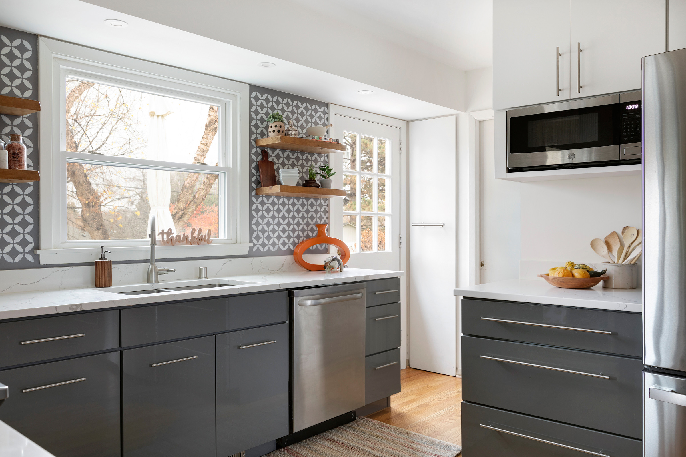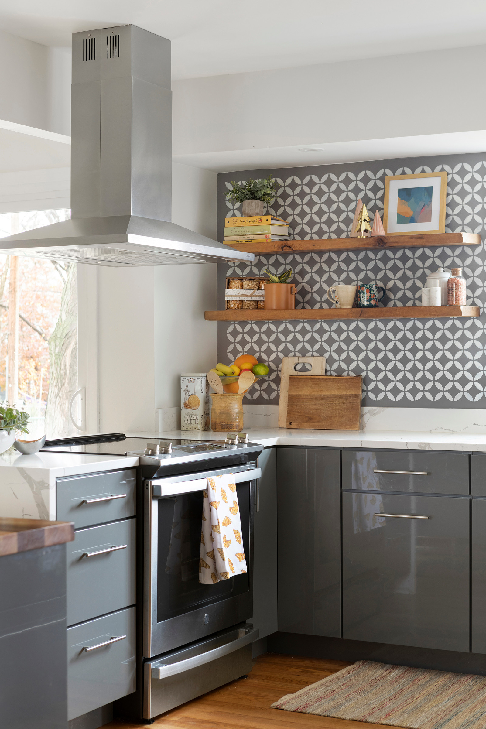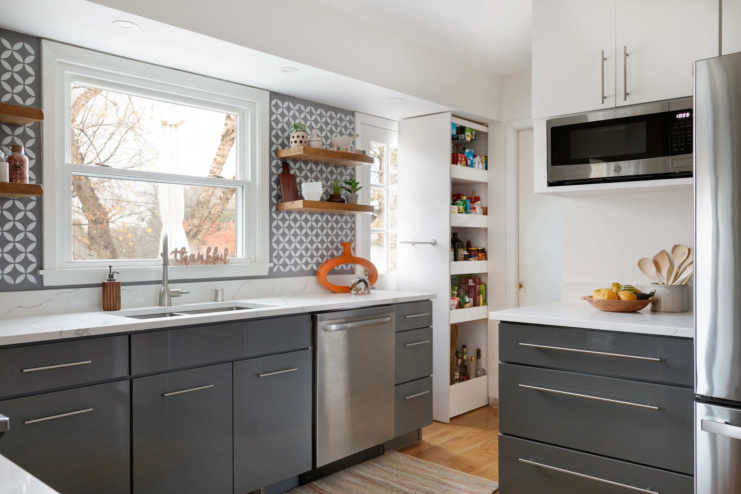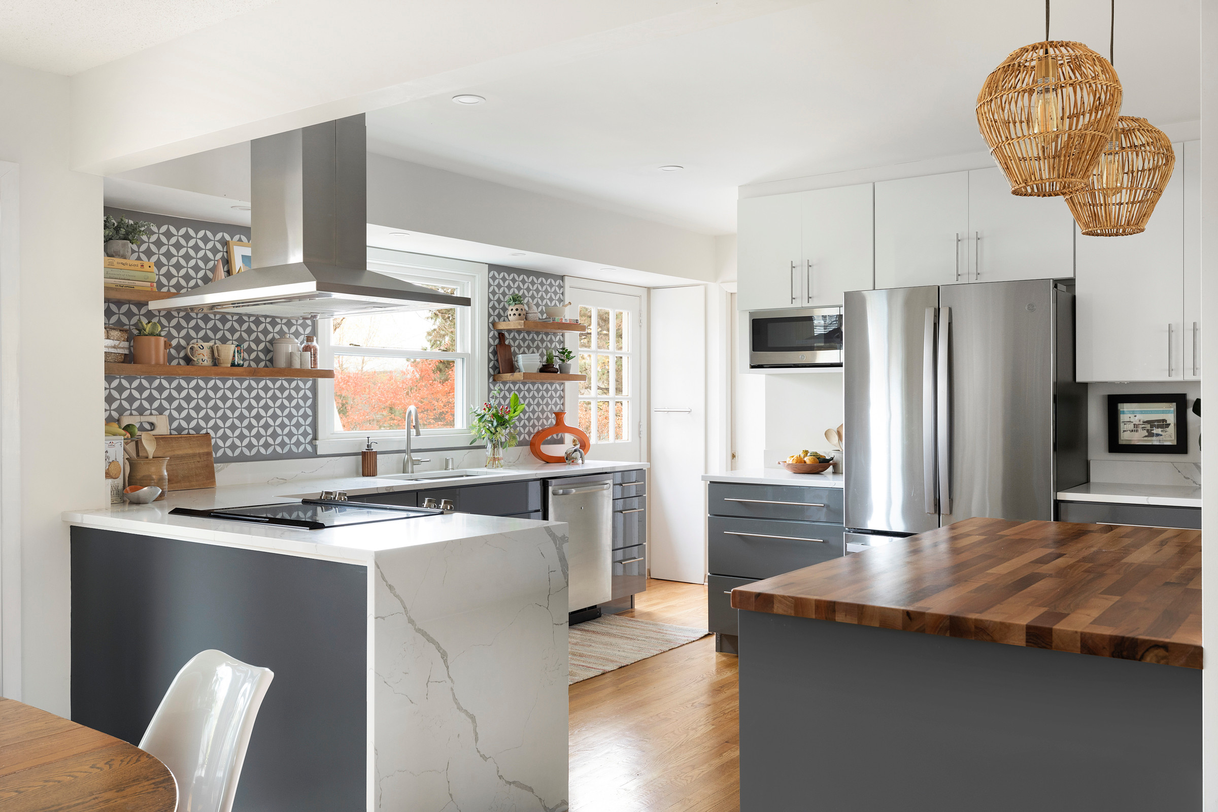 For help, they turned to builder Brent Darr and designer Kelly Vickers. The remodeling team took down walls to open the kitchen to the nearby dining room and living room. They created a new layout with an efficient work triangle and more cabinets. And they gave the space a warm and inviting style with glossy gray flat-panel cabinets, a walnut butcher block island and a white-and-gray painted stencil backsplash feature that mimics the look of tile.