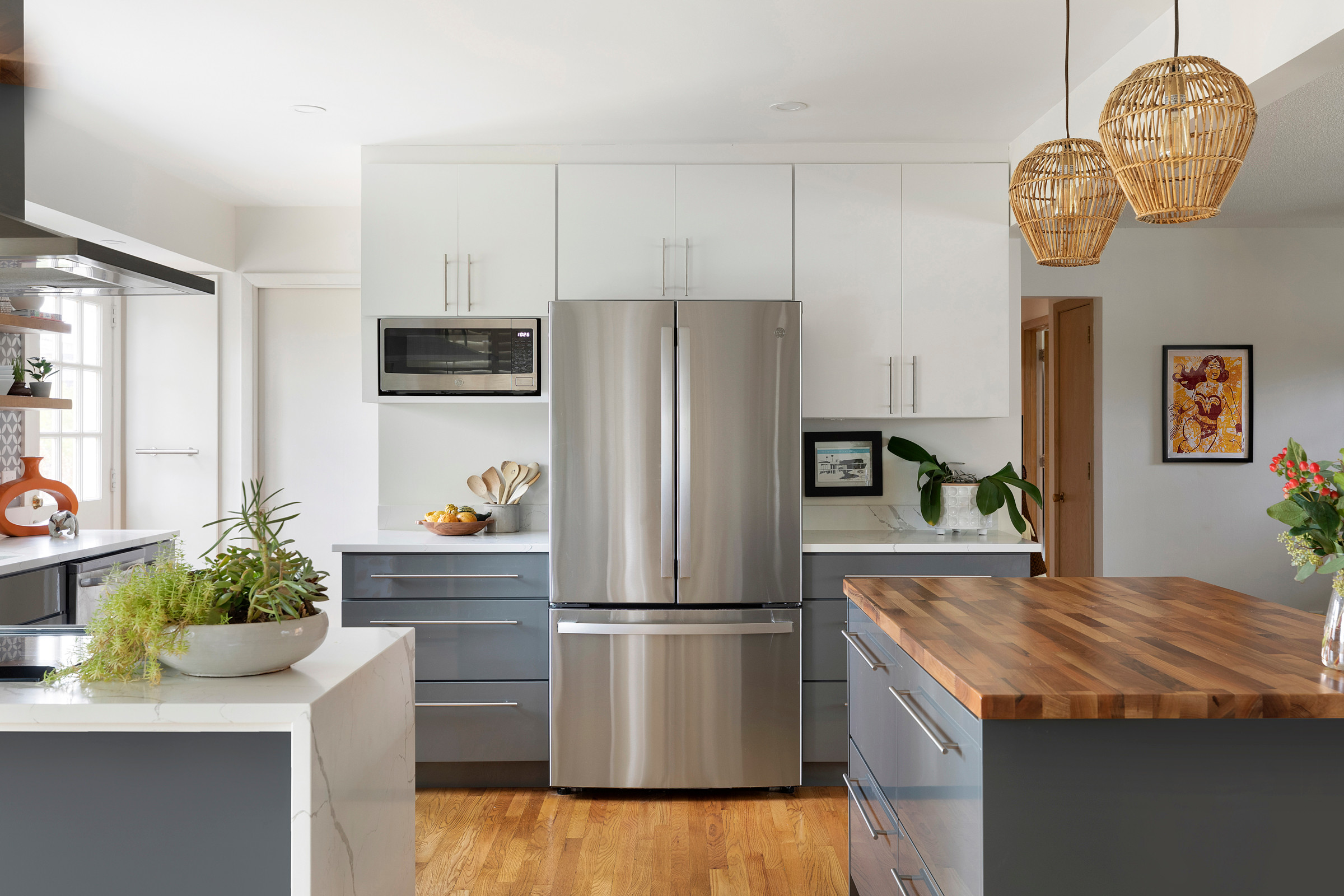 An island with two stools now connects the kitchen to the living room. Its walnut butcher block top adds warmth and extra work surface. Rattan pendants and faux white fur seat covers give a subtle bohemian touch. The island is integrated into a sheetrock-wrapped support post that replaced what was a load-bearing wall.