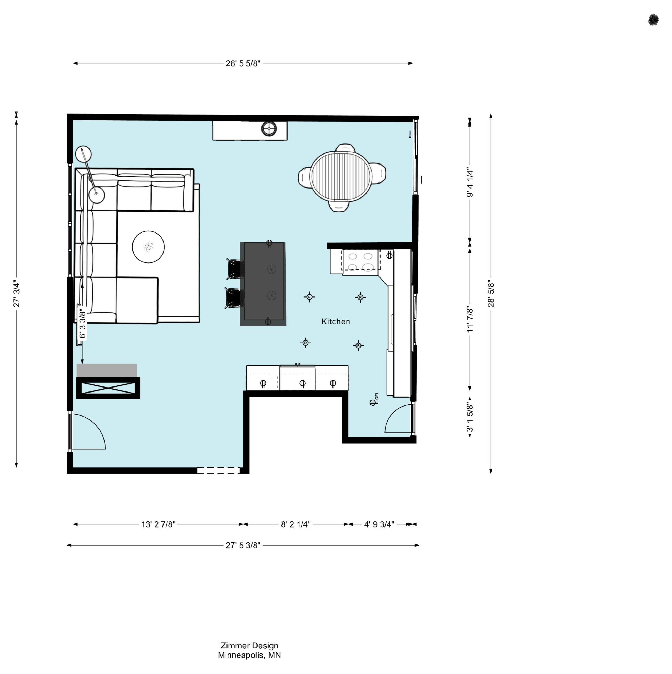 This floor plan shows the updated kitchen’s new open layout with the living room (left) and dining room (top right).