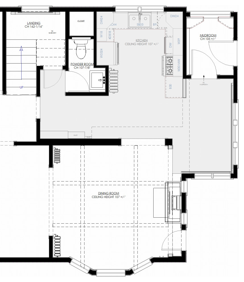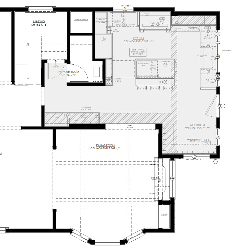 After: The kitchen sink is now in the former mudroom space (top right). Expanding the kitchen created room for a compact island (upper right center). A new mudroom (far right middle) sits open to the kitchen. “We wanted to bring in some architectural details of the home while modernizing the functionality, and also add a few unexpected details,” Roos says.