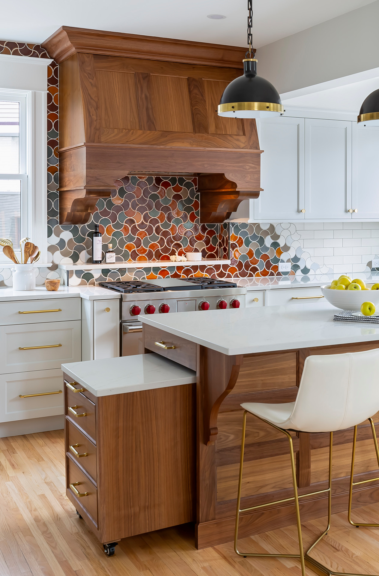 Roos took over a mudroom to expand the kitchen, adding 45 square feet and freeing up room for an island with seating. A nifty rolling baking cart can tuck away into the island. The walnut island coordinates with a focal point range hood and red oak flooring to add warmth to the light gray perimeter cabinets and white tile. A colorful handmade backsplash design over the range punches up the space with playful personality.
