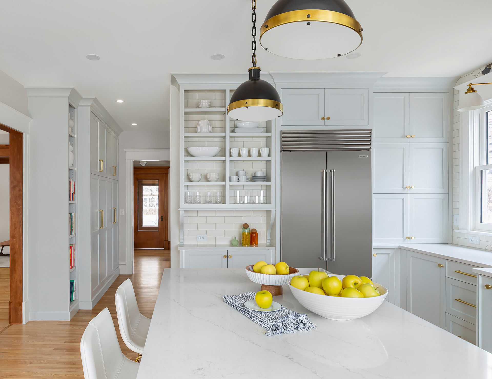 An island end conceals a special rollout baking cart with drawers for supplies and a low work surface that allows family members to comfortably knead dough. The surface and all other countertops are engineered quartz that mimics the look of classic marble.